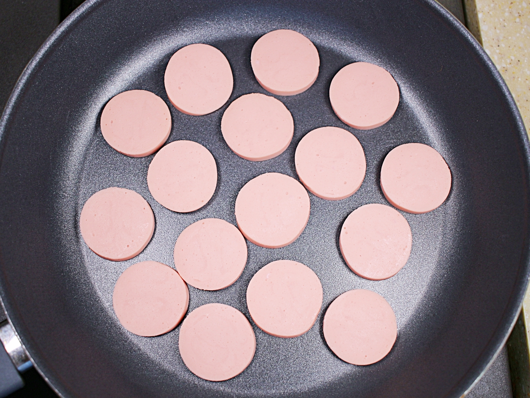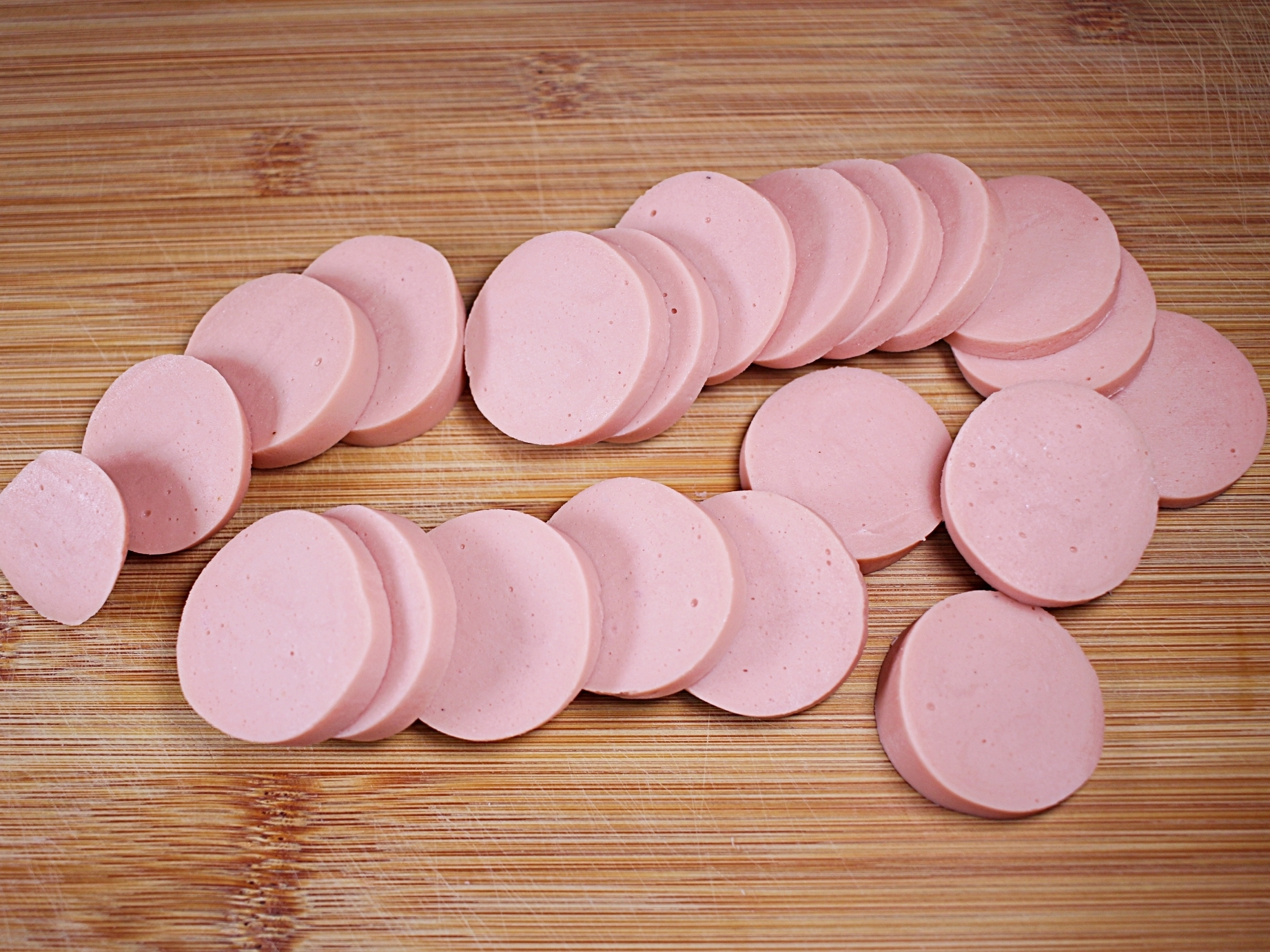 분홍소시지를 일정한 두께로 썰어주세요.