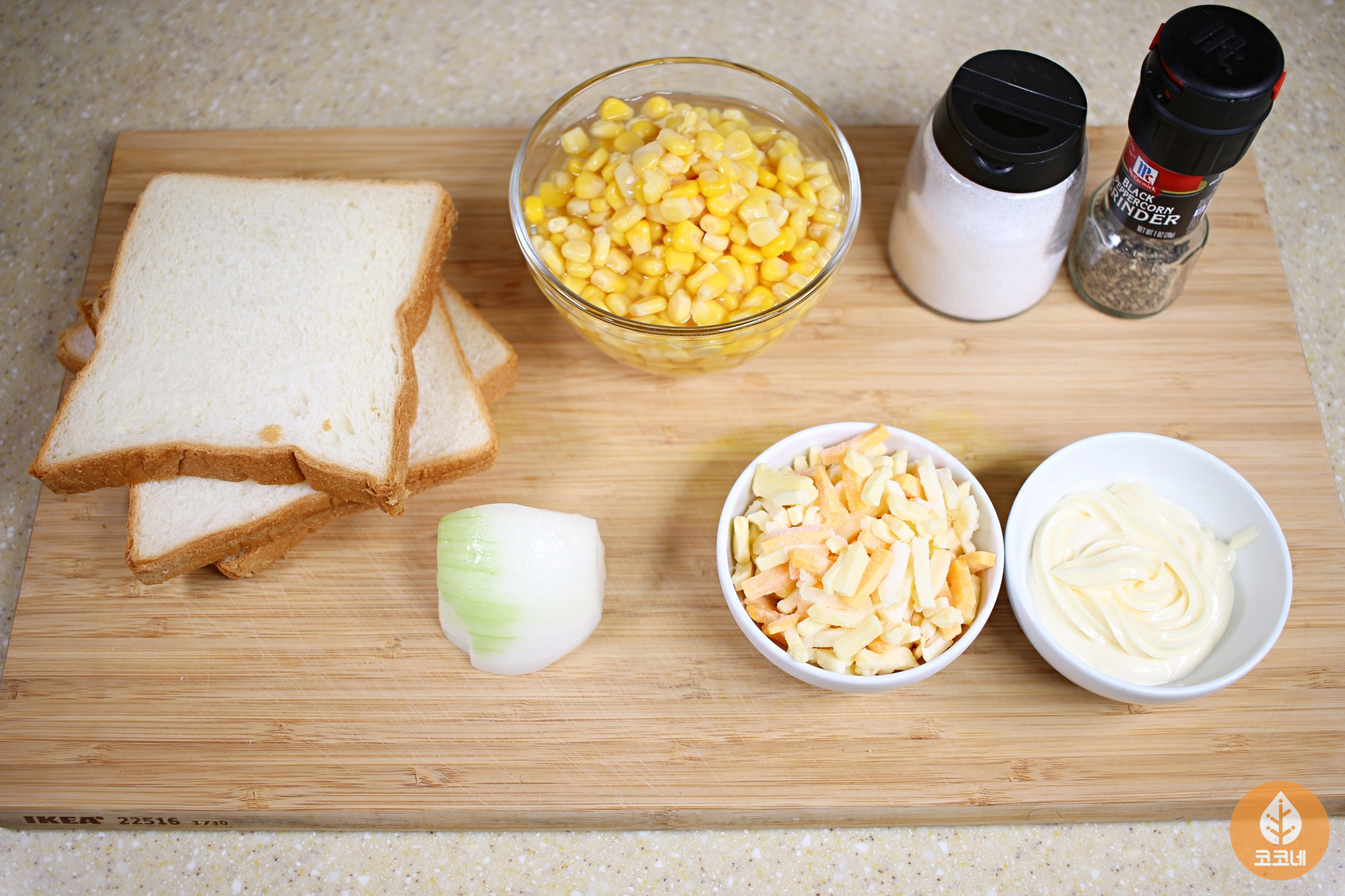 재료는 캔옥수수, 모짜렐라치즈, 식빵, 양파,