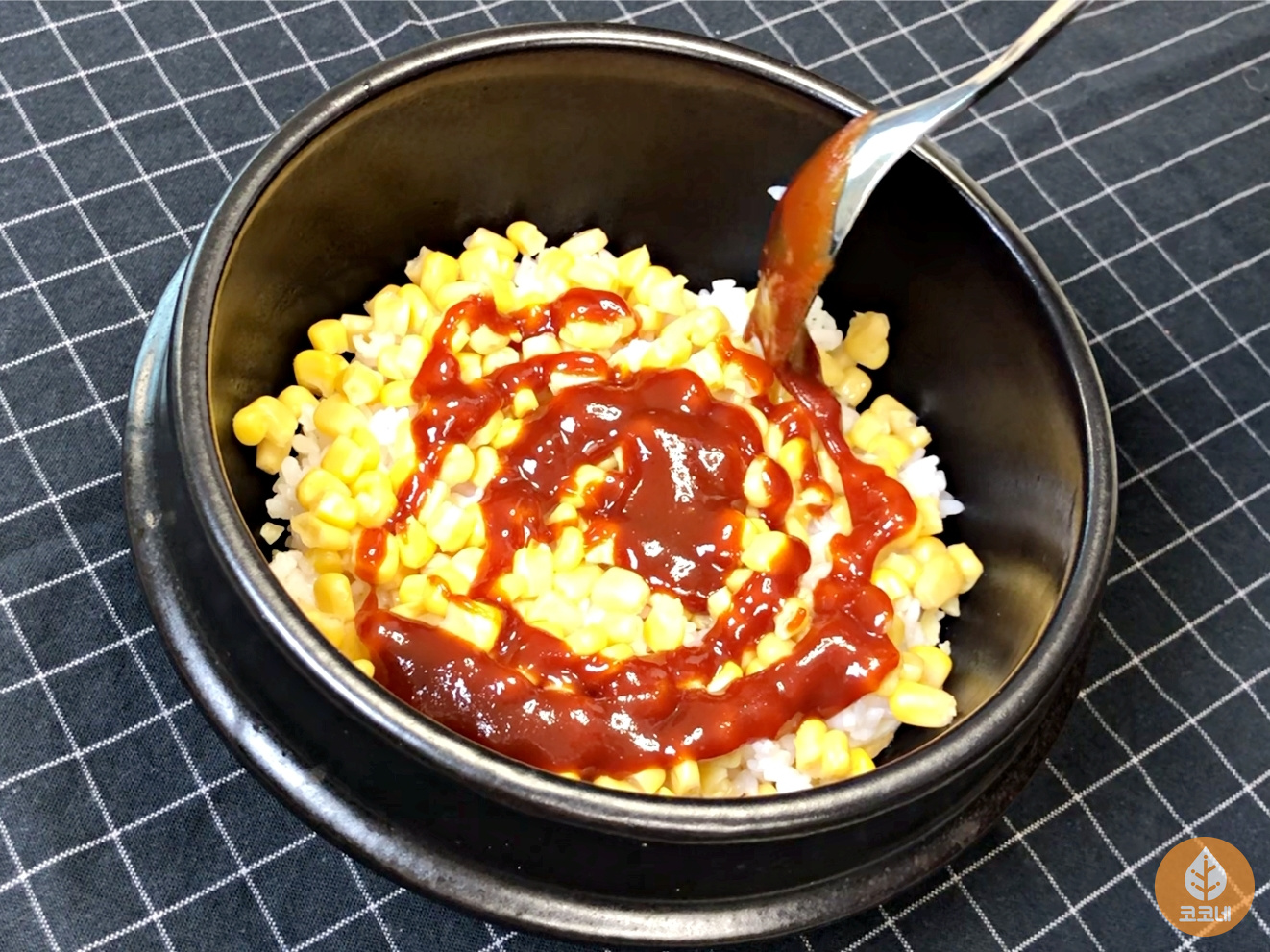 밥 위에 물기를 뺀 캔옥수수도 넣어요.