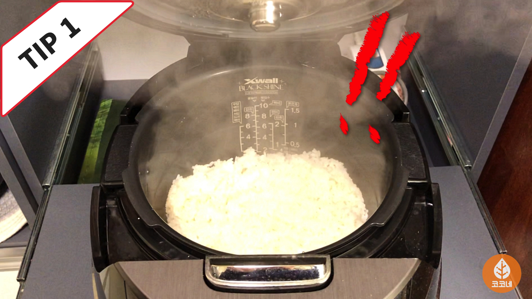 찜기, 갓 지은 밥솥, 전자레인지와 머그컵.