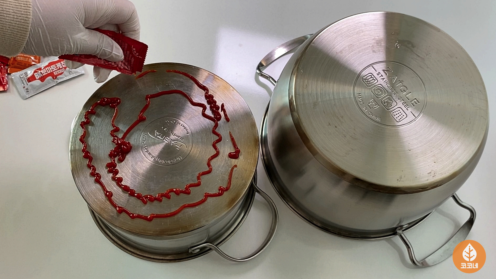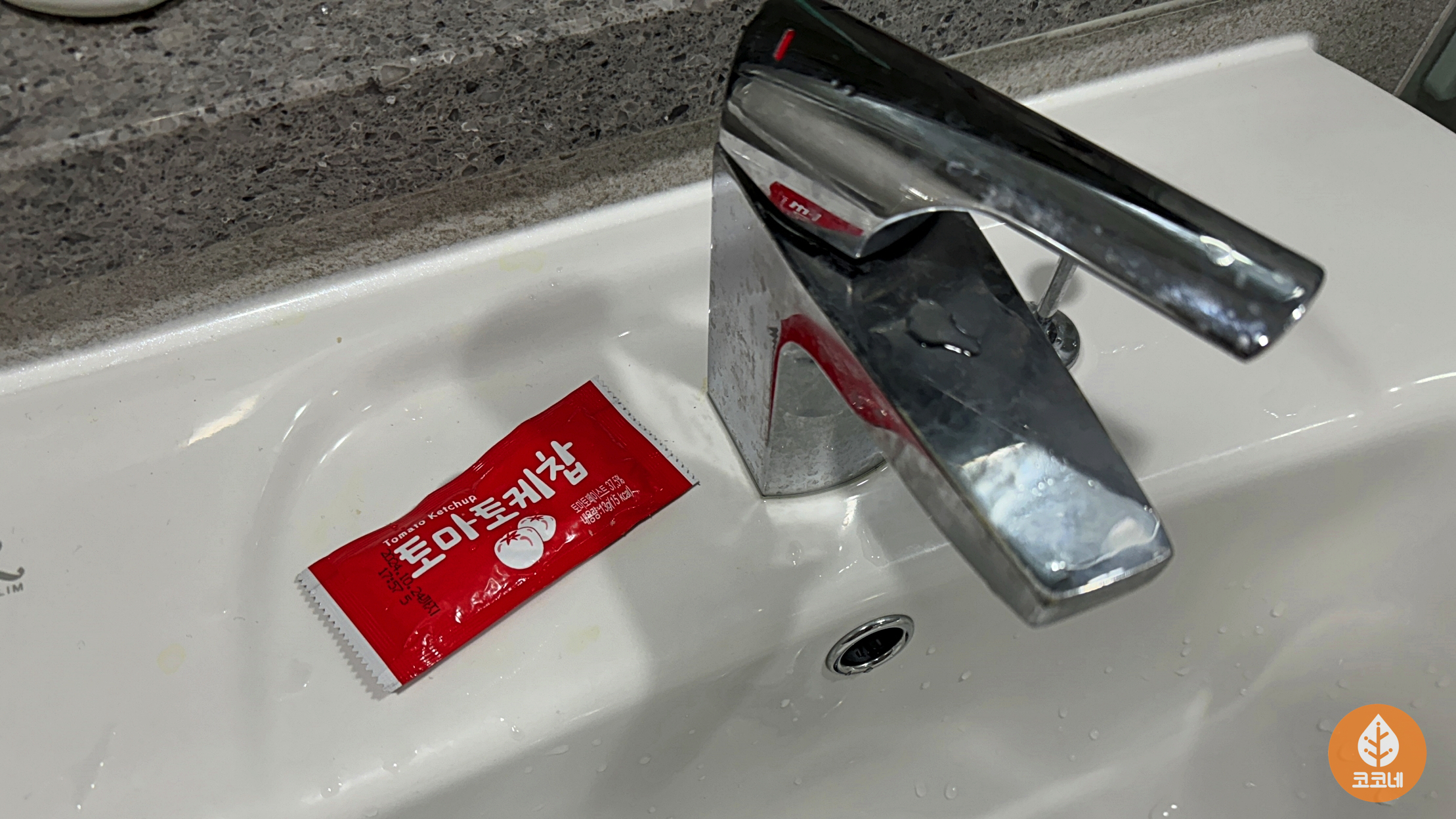수도꼭지에 일회용케첩을 듬뿍 뿌려주세요.