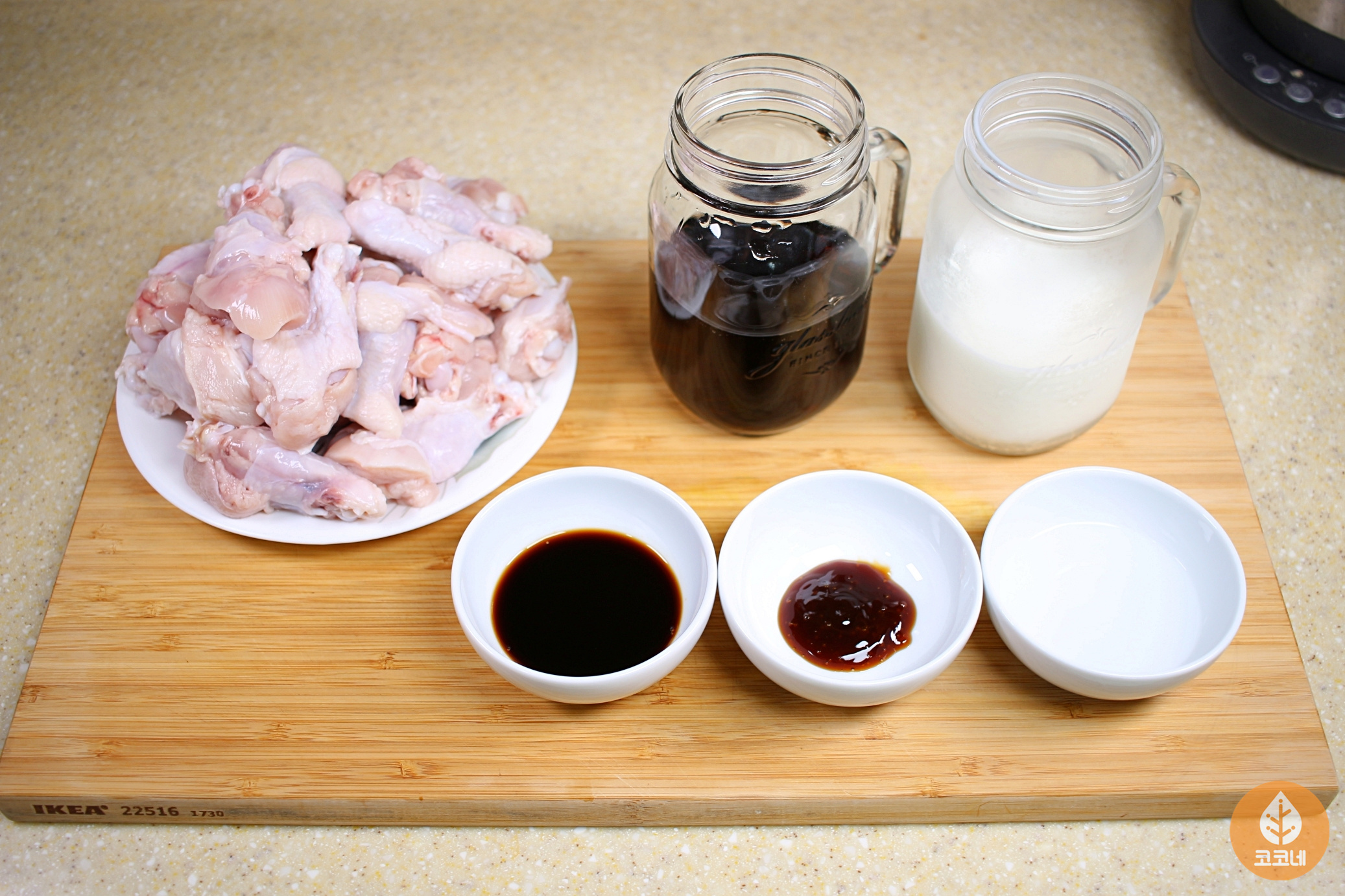 재료는 닭고기, 콜라, 우유, 간장, 굴소스, 맛술.