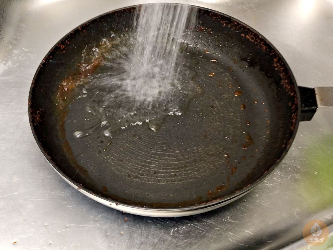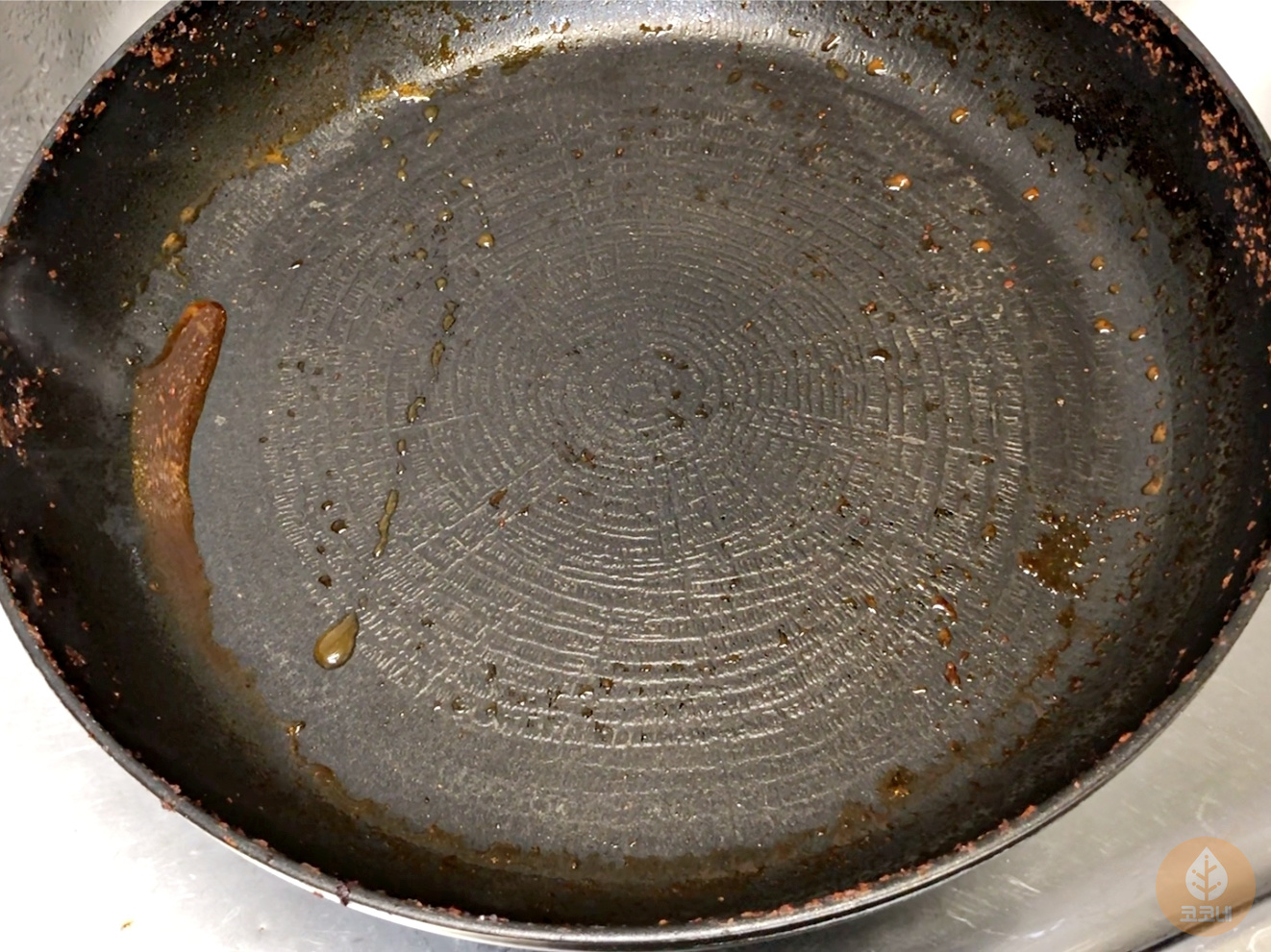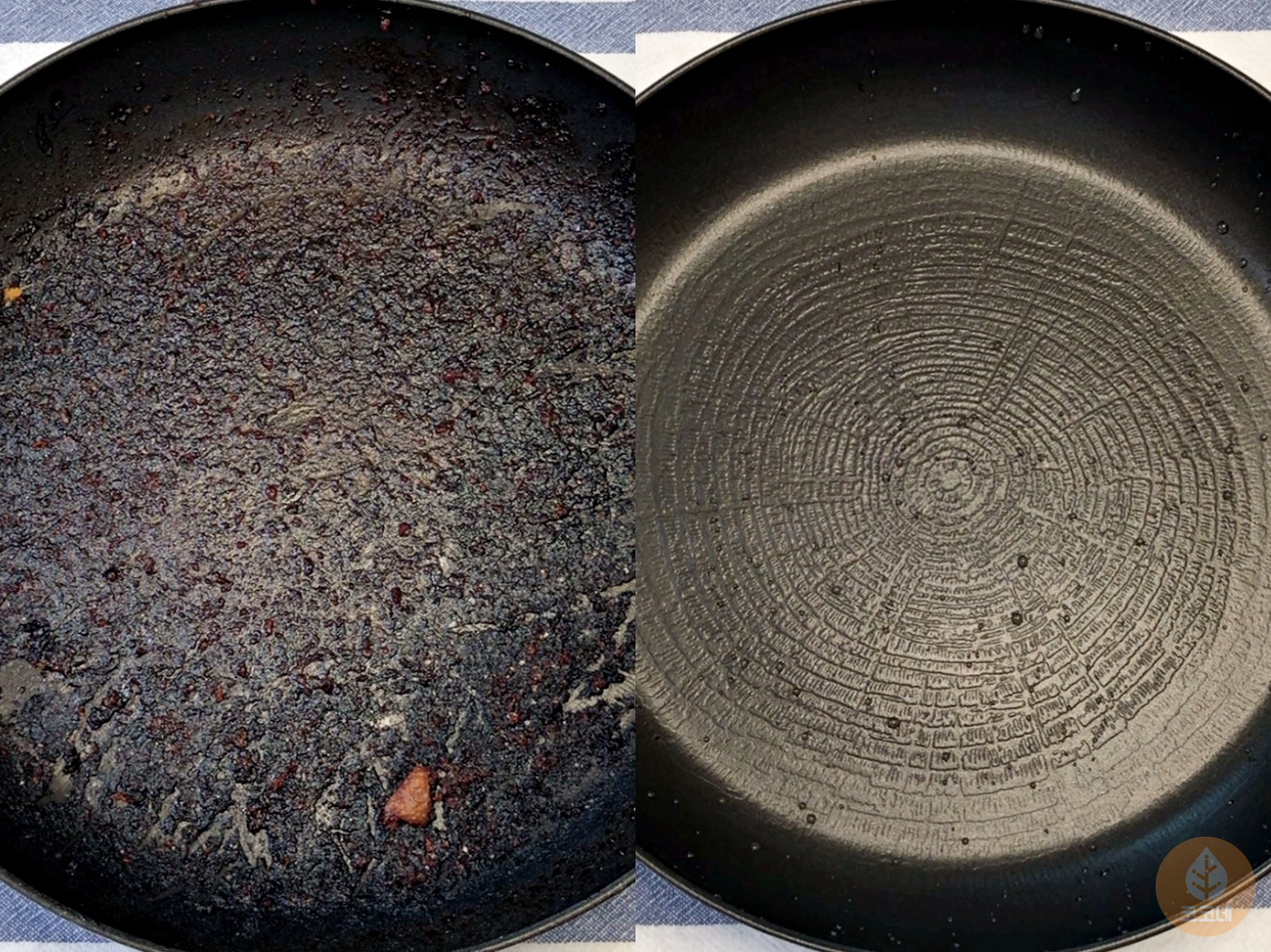 냄비나 후라이팬 바닥과 탄 자국 사이에