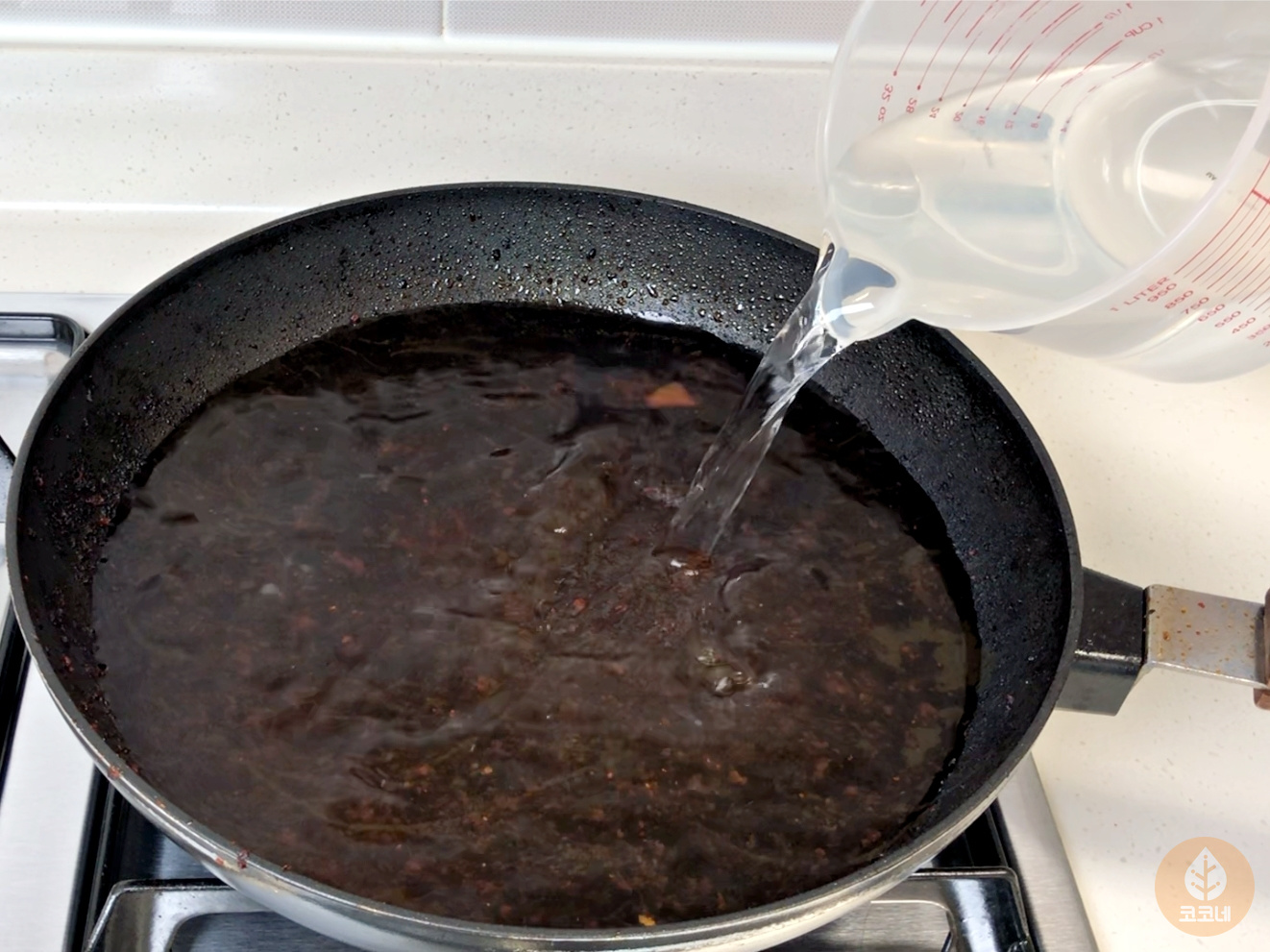 탄 냄비나 후라이팬에 물을 1/2 채워주세요.