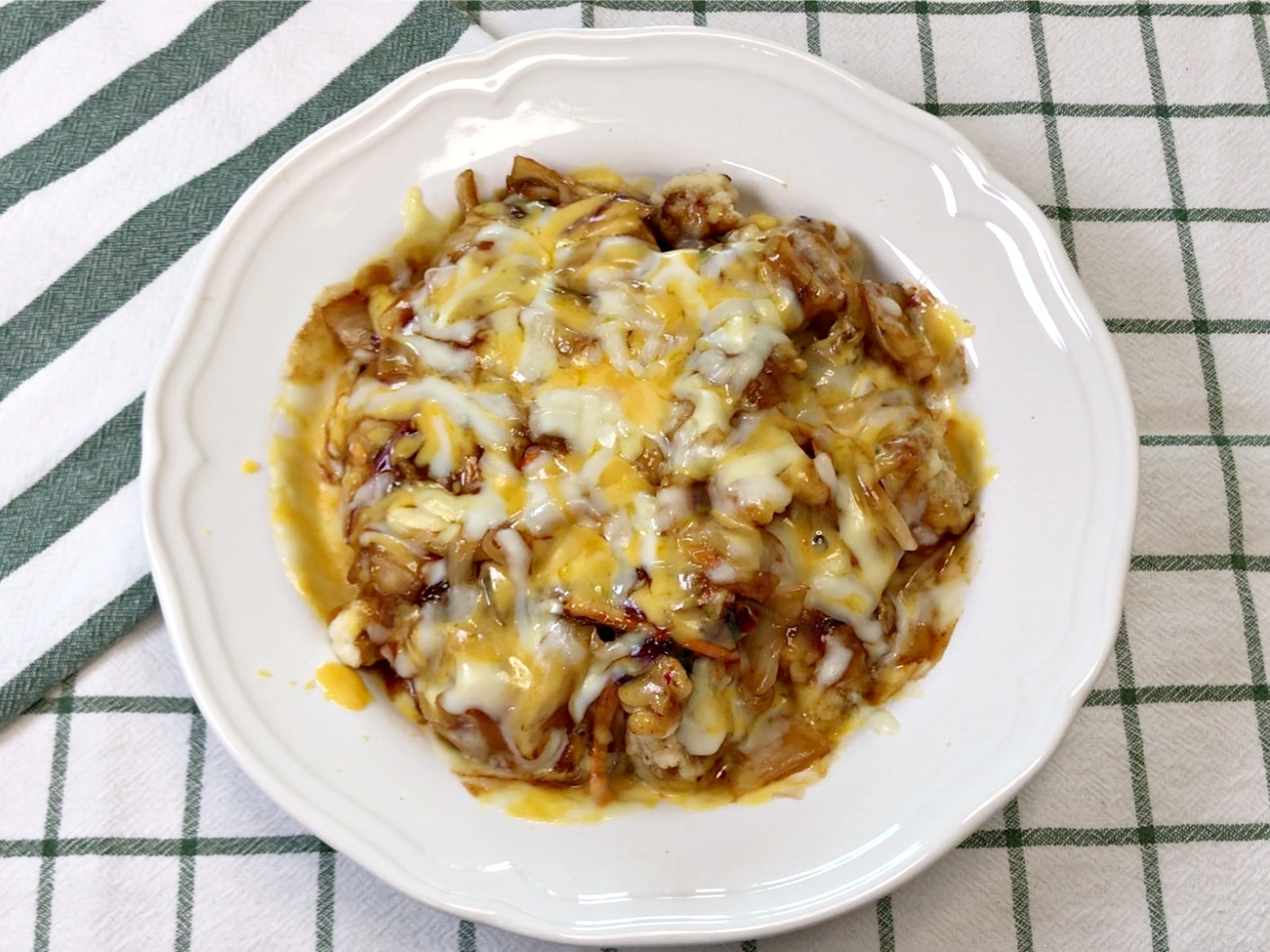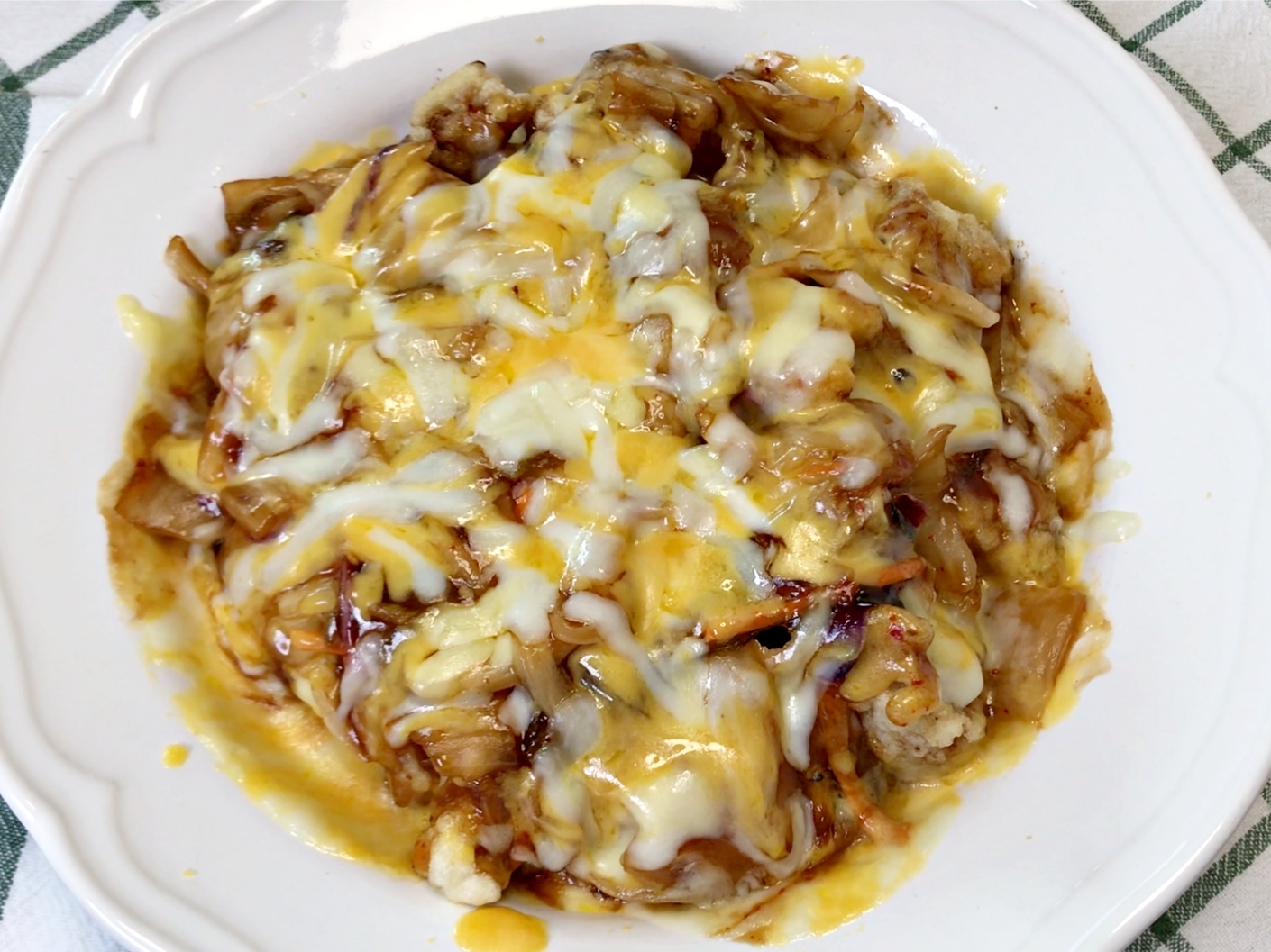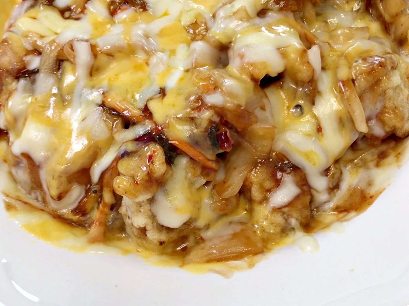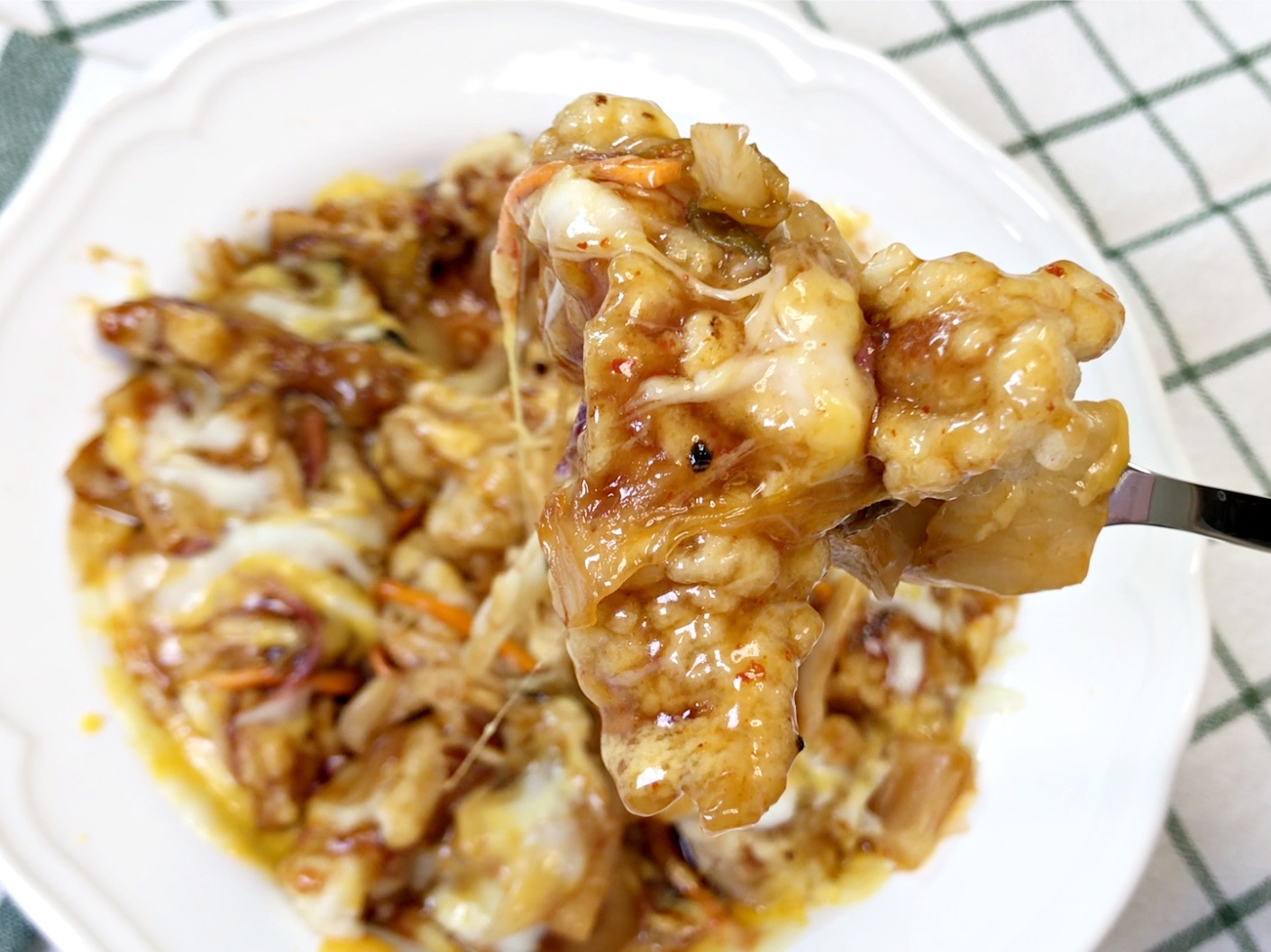 재료는 남은 탕수육과 소스, 김치, 치즈, 설탕 준비해 주세요.