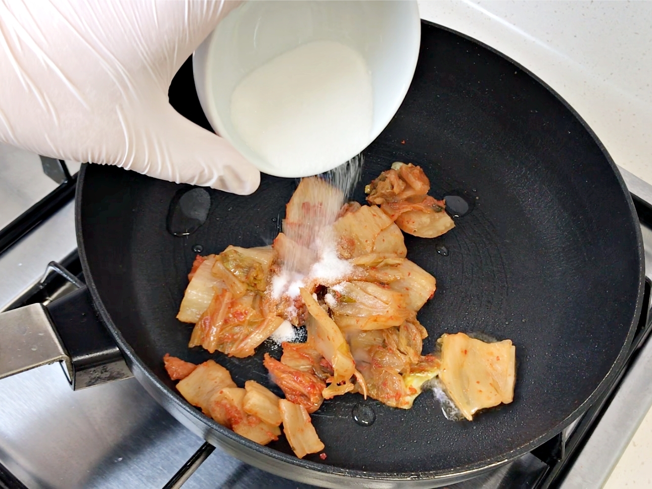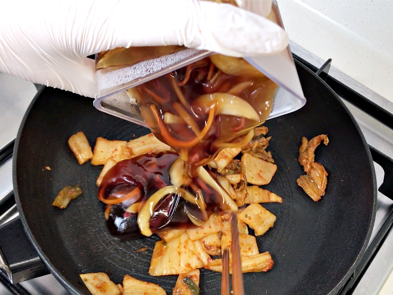 김치가 맛있게 볶아지면 남은 소스를 부어주세요.