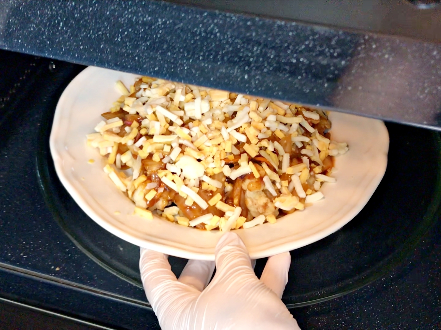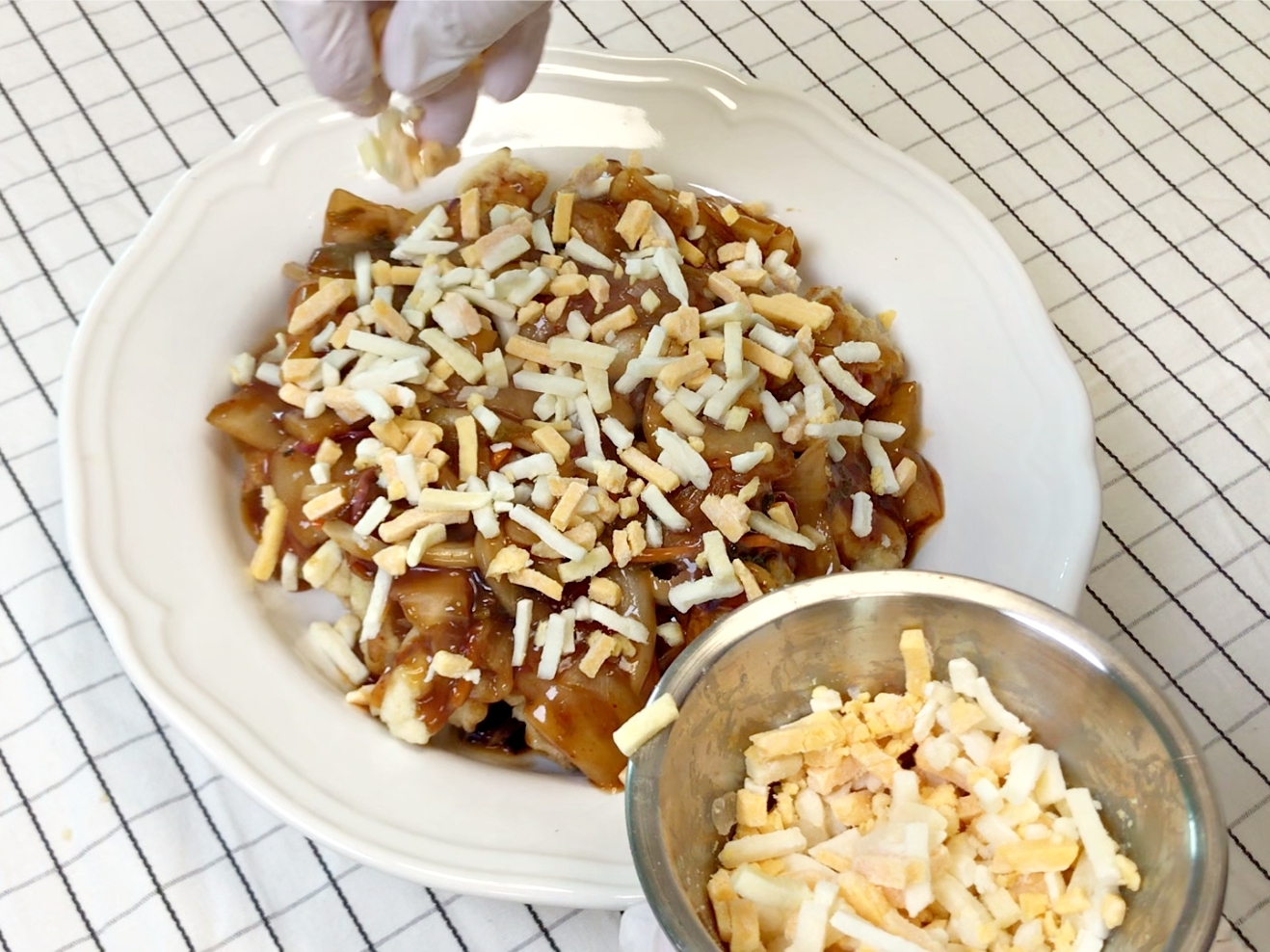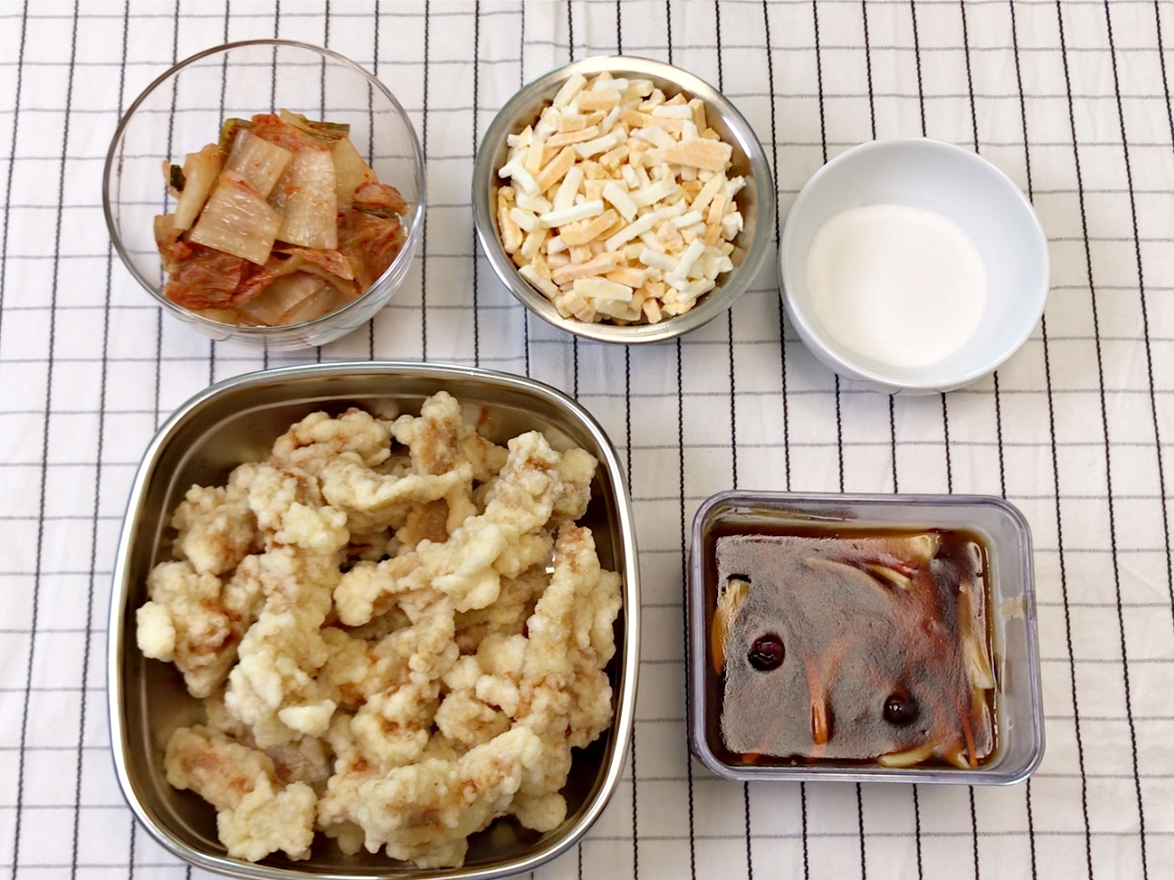 재료는 남은 탕수육과 소스, 김치, 치즈, 설탕 준비해 주세요.