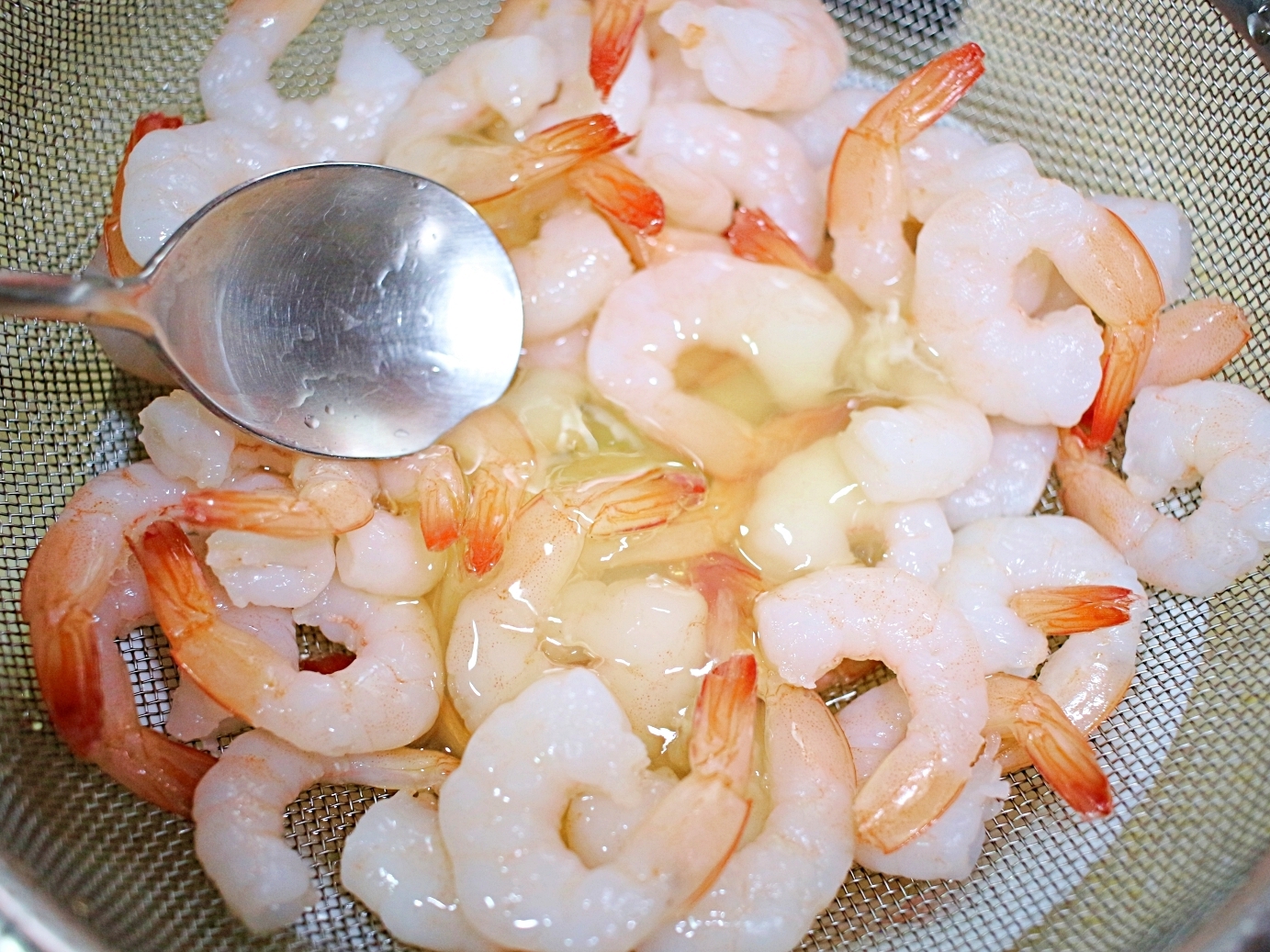 물기 뺀 새우에 계란 흰자를 넣고 골고루 버무려요.