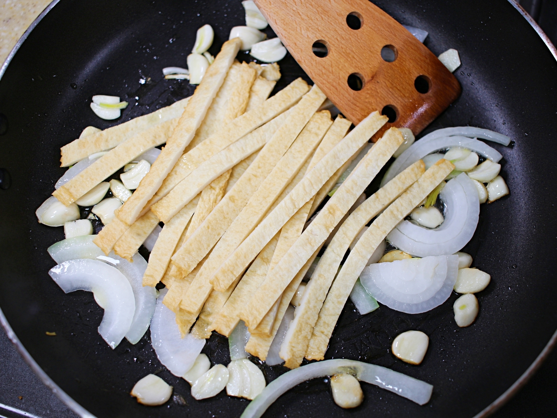 마늘향이 충분히 올라오면 양파를 넣고 볶아주세요.