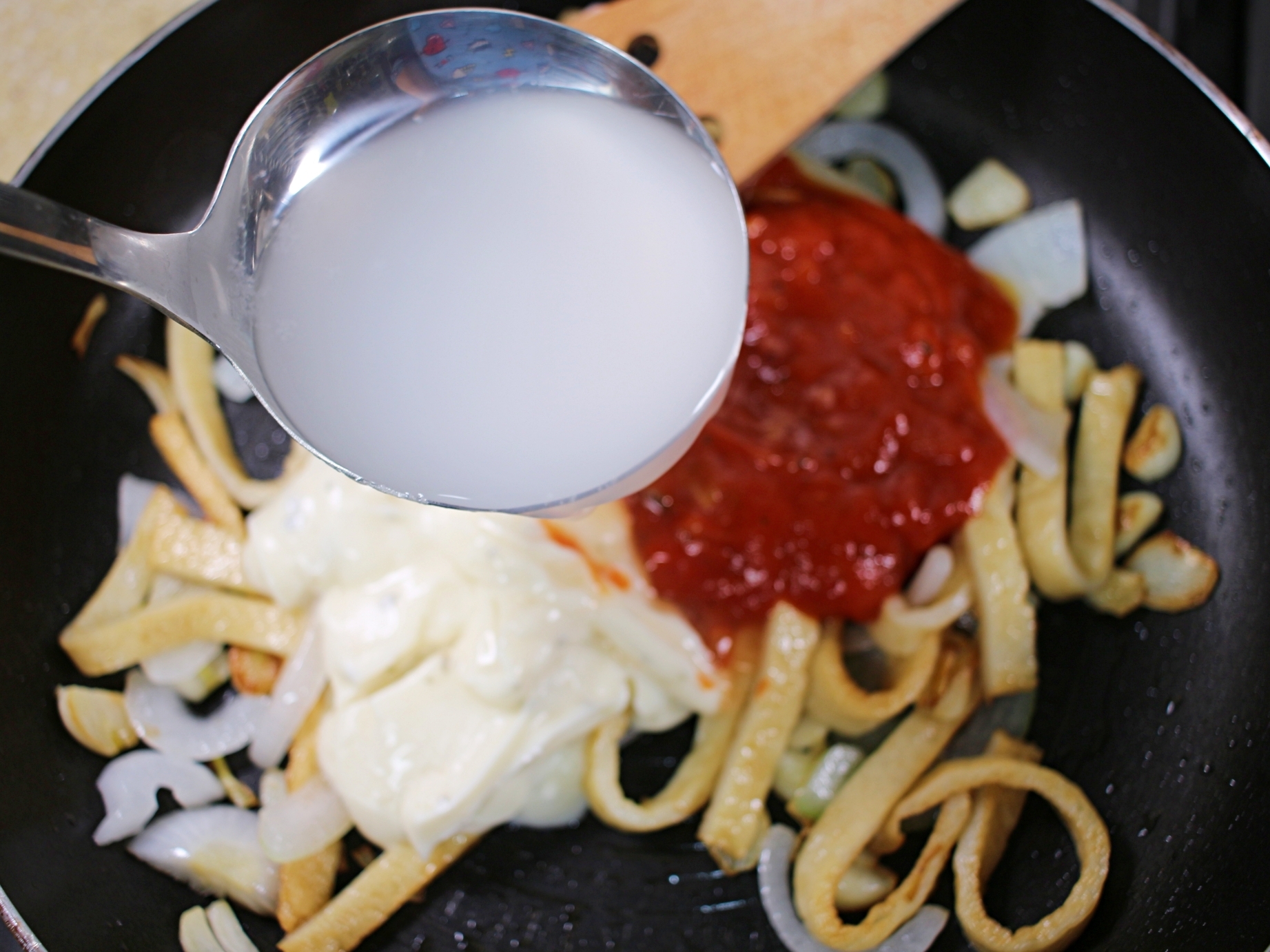 어묵이 연한 갈색으로 익으면 파스타소스를 붓고