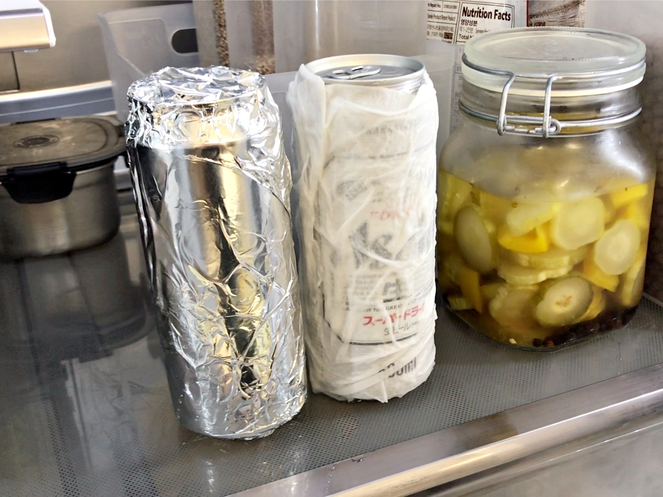 쿠킹호일이나 물에 적신 키친타월로 음료를 감싸 냉장실,