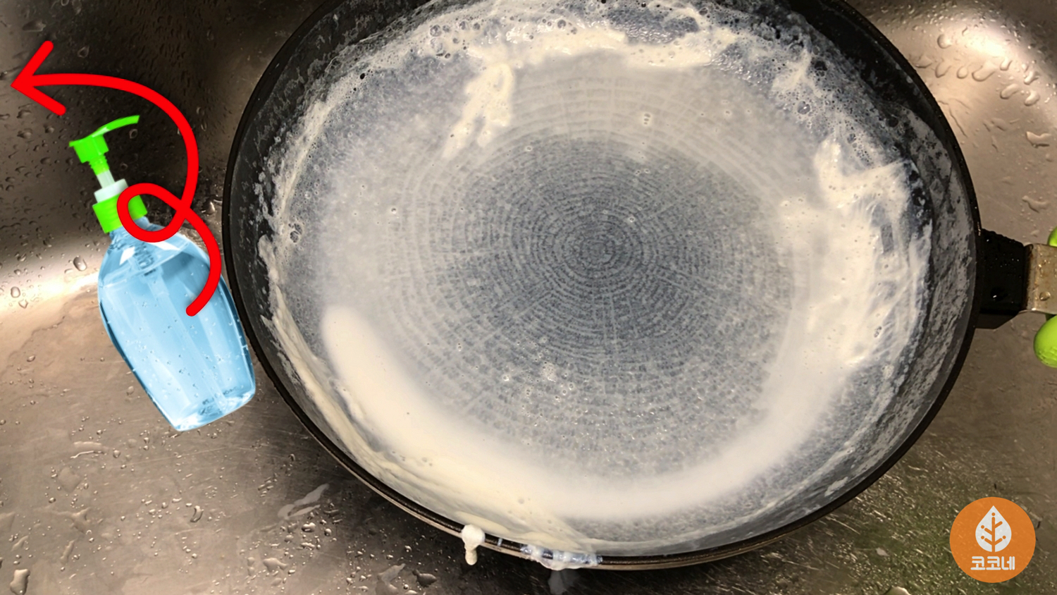 프라이팬에 반을 넘지 않게만 부어주세요.