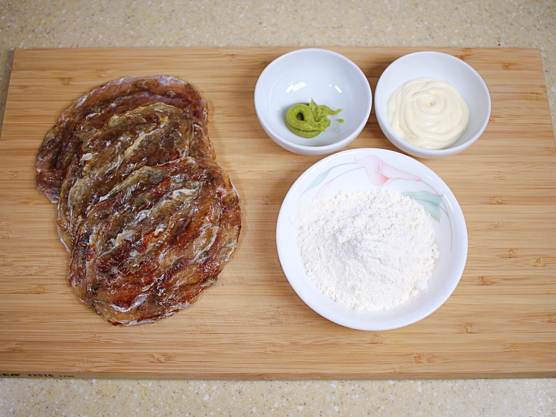 쥐포, 튀김가루, 마요네즈, 고추냉이 준비했어요.