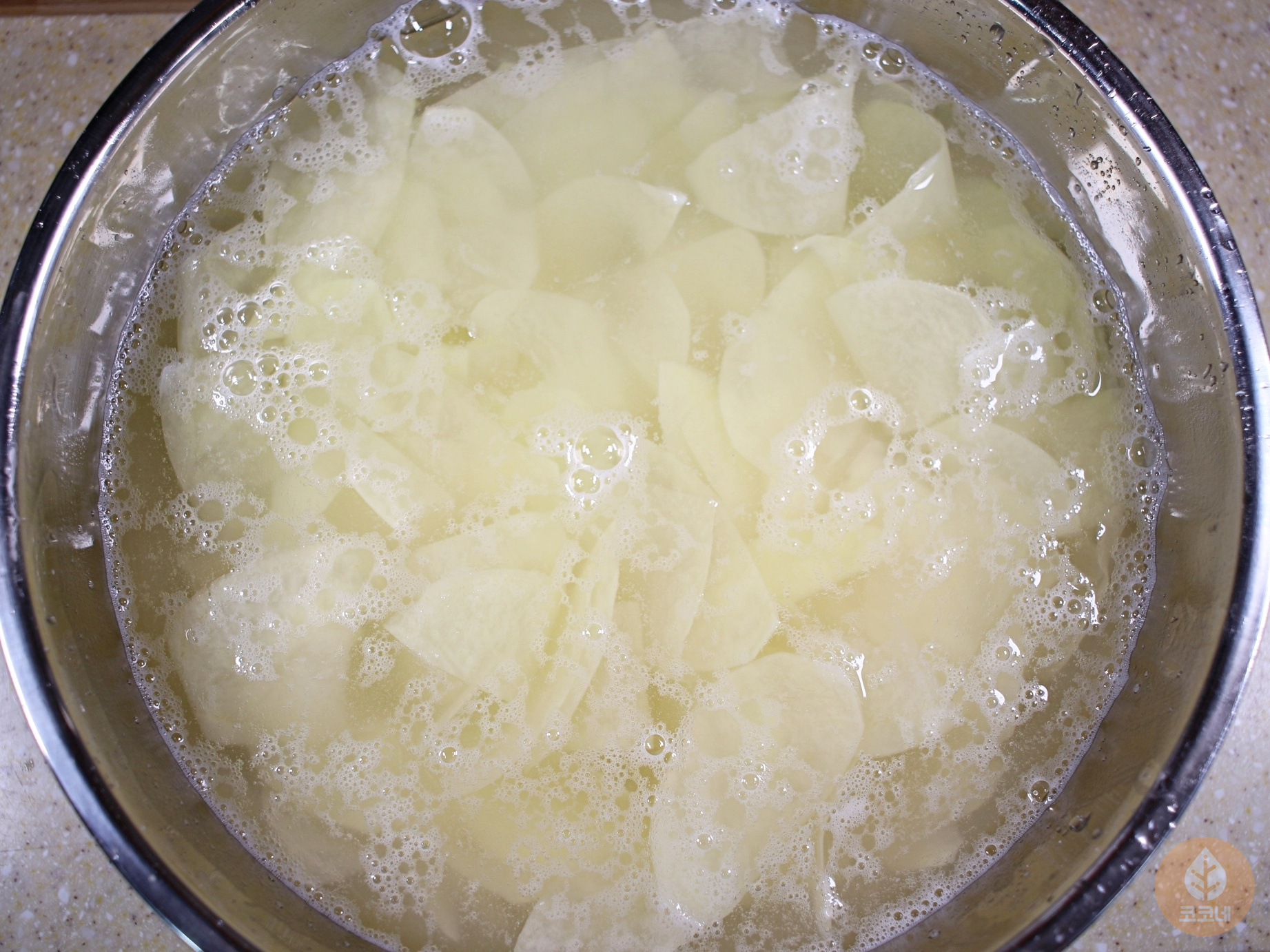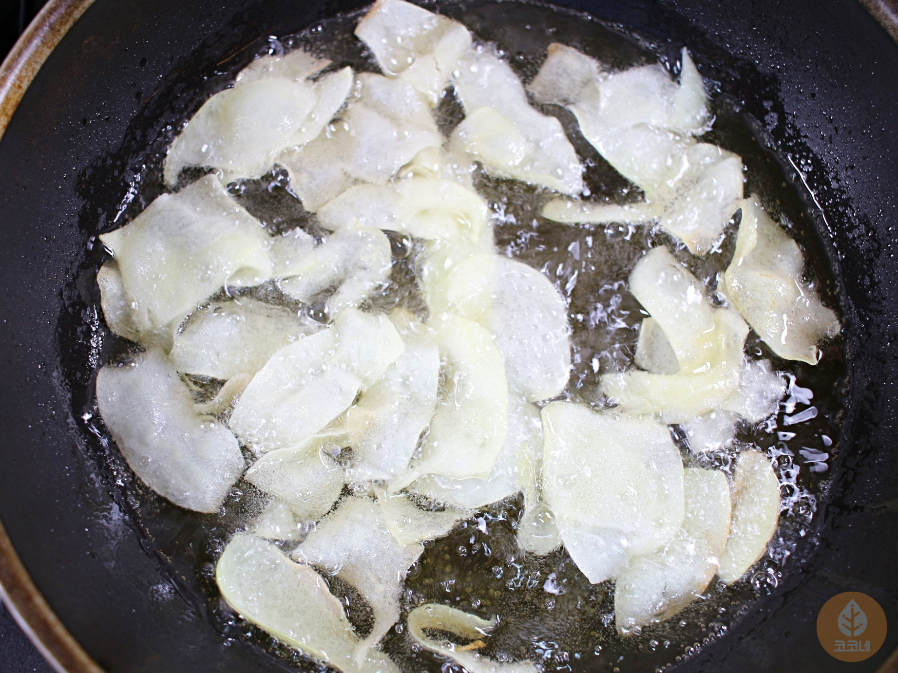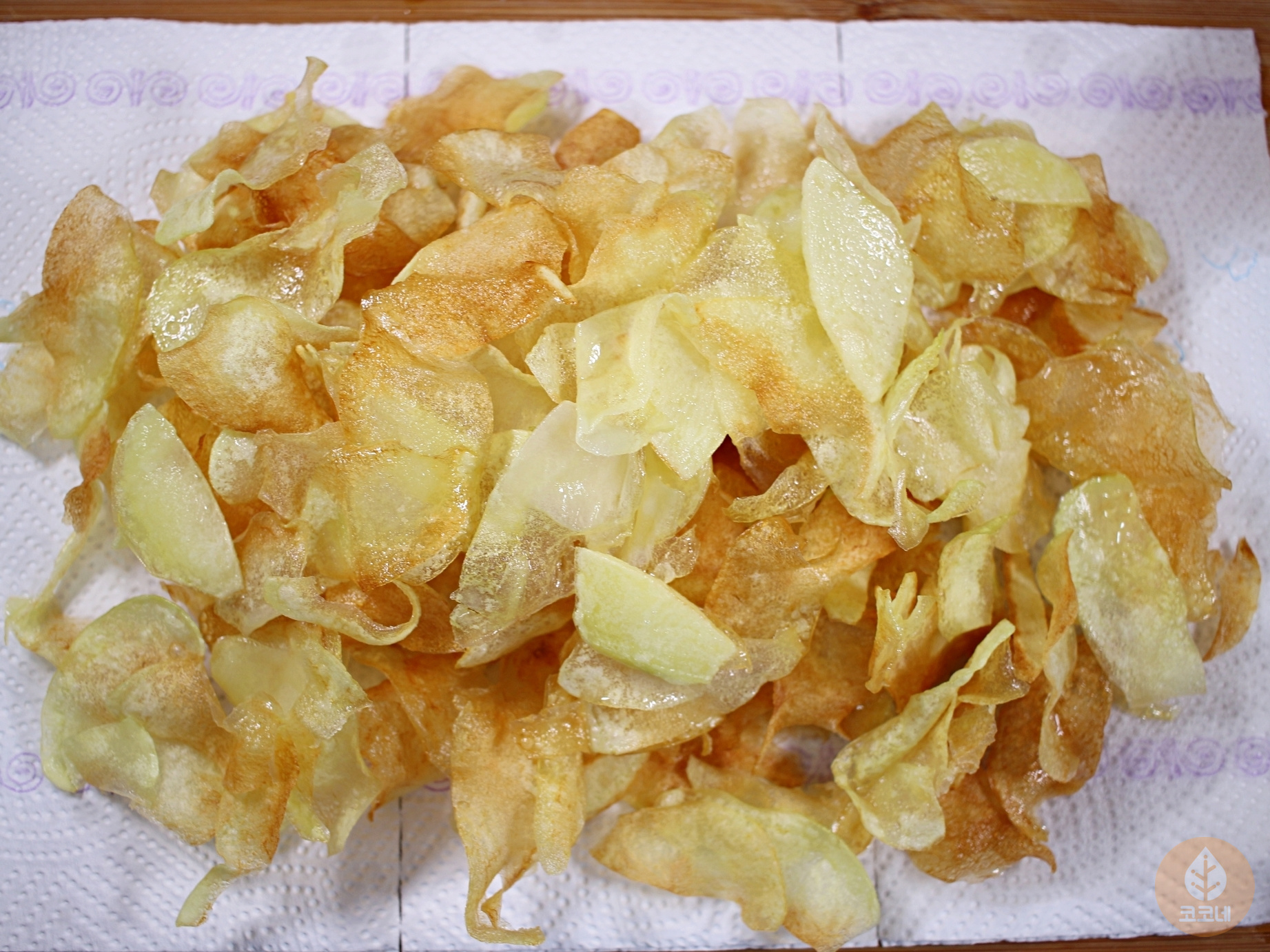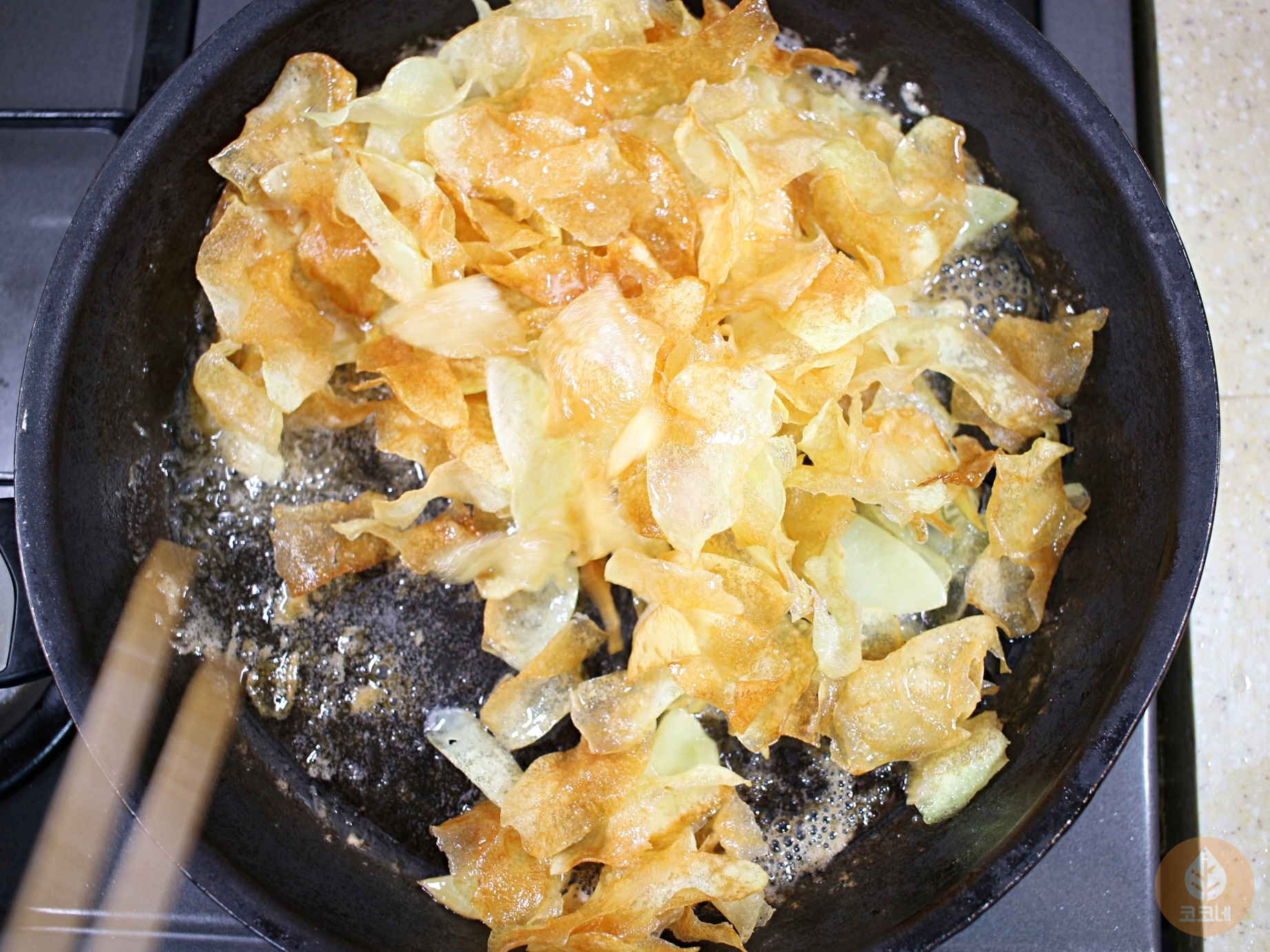 감자가 워낙 얇기 때문에 금세 바삭하게 튀겨져요.