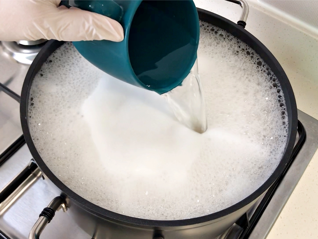 물이 끓어오르면 바로 찬물 한컵을 부어요.