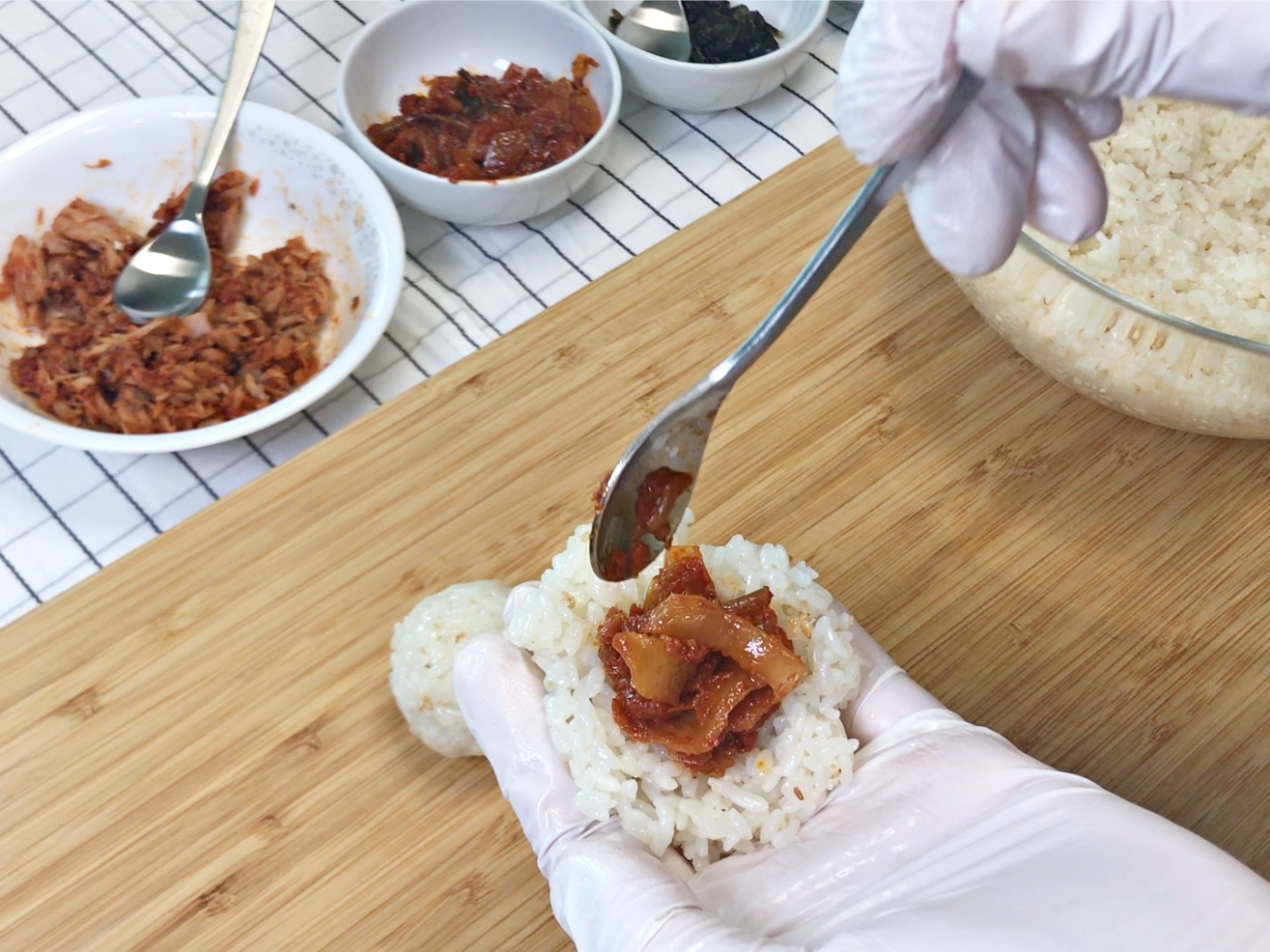 새콤달콤한 김치볶음도 주먹밥 재료로 딱 좋아요.