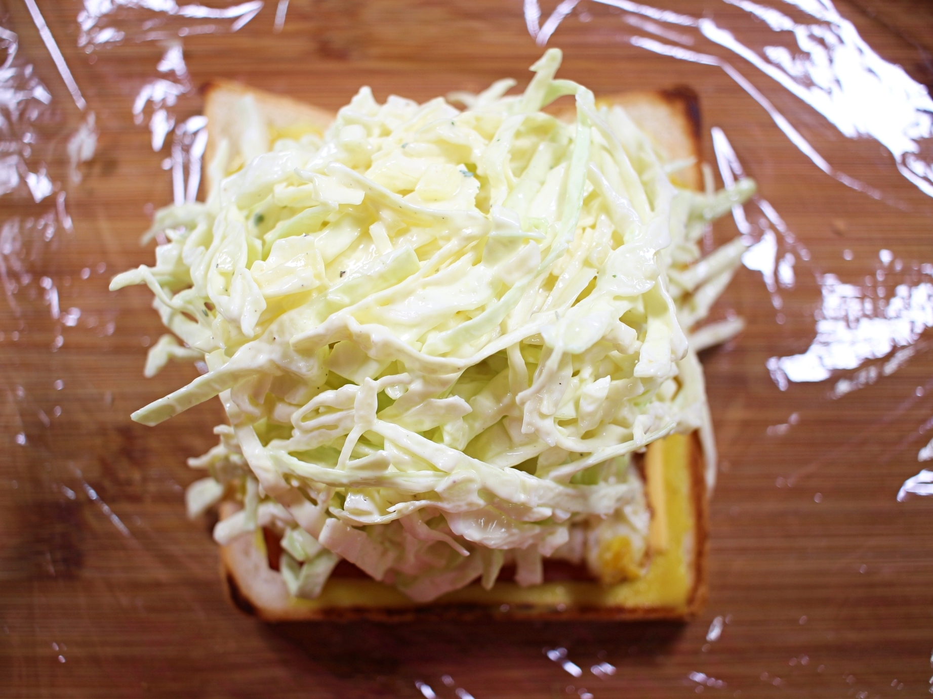 치즈, 햄, 달걀, 양배추 샐러드를 듬뿍 올린 뒤