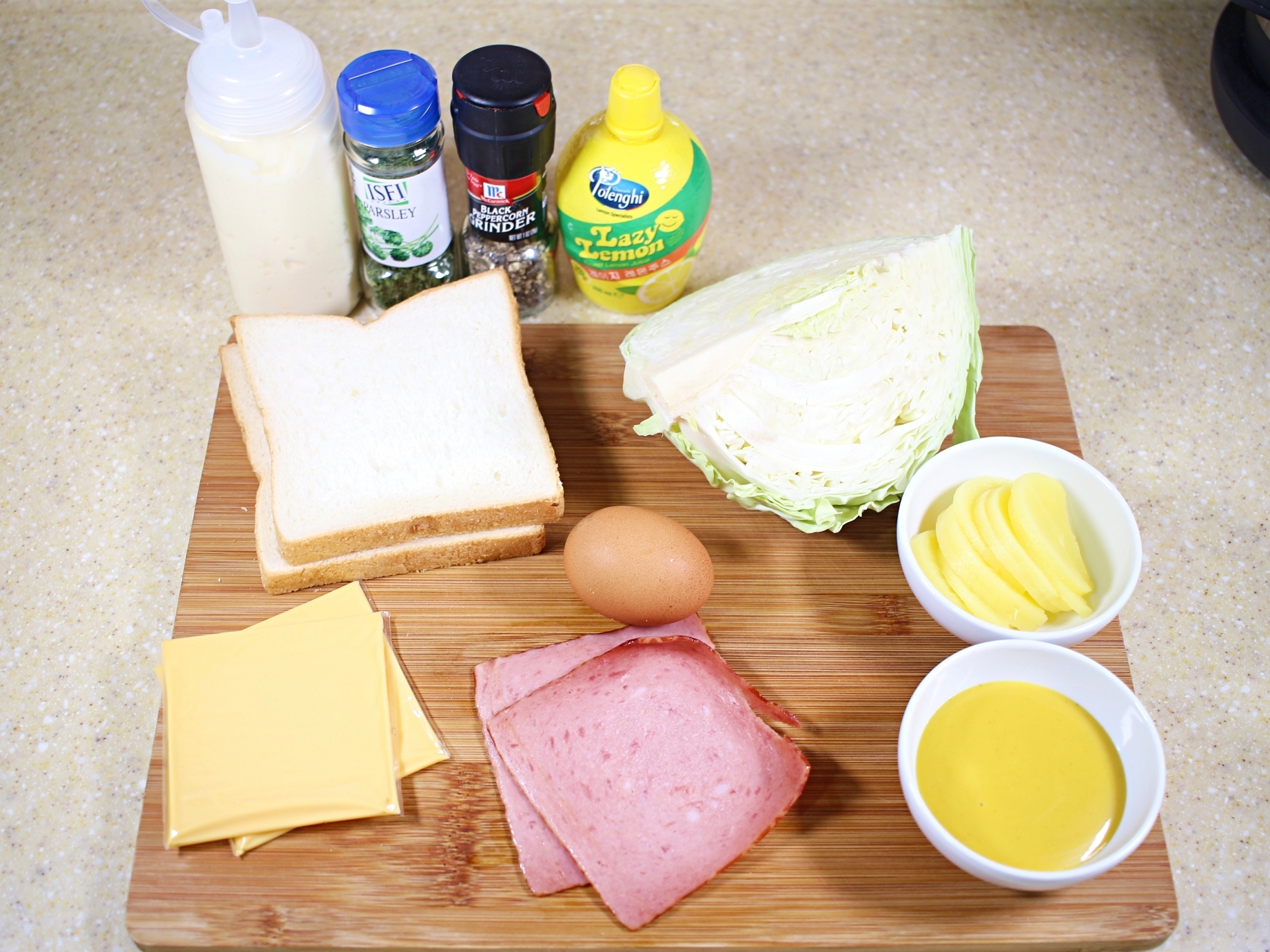 재료는 양배추, 식빵, 달걀, 치즈, 슬라이스햄, 단무지.