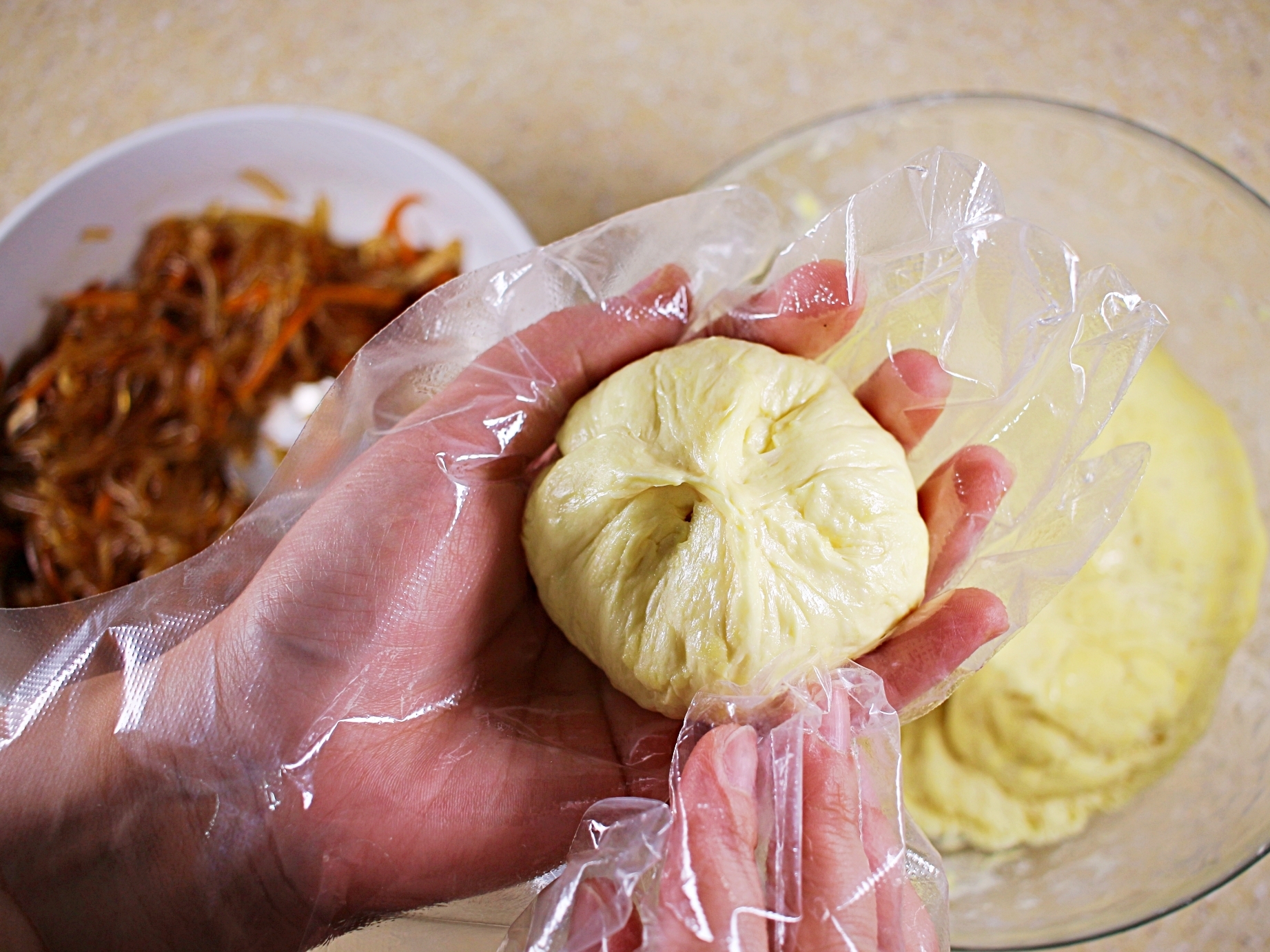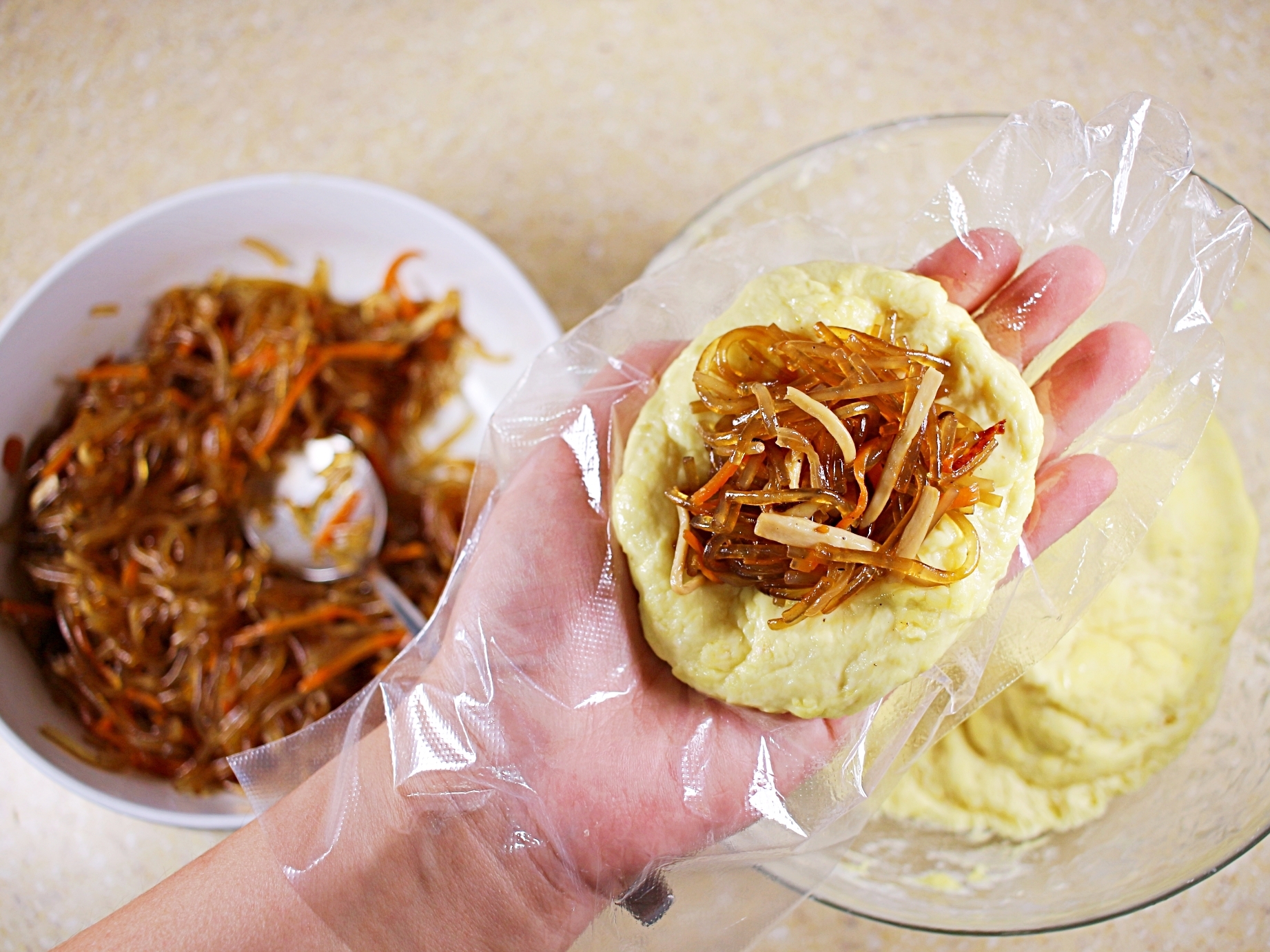 반죽을 동그랗게 펴고 잡채를 넣어 오므리면 돼요.