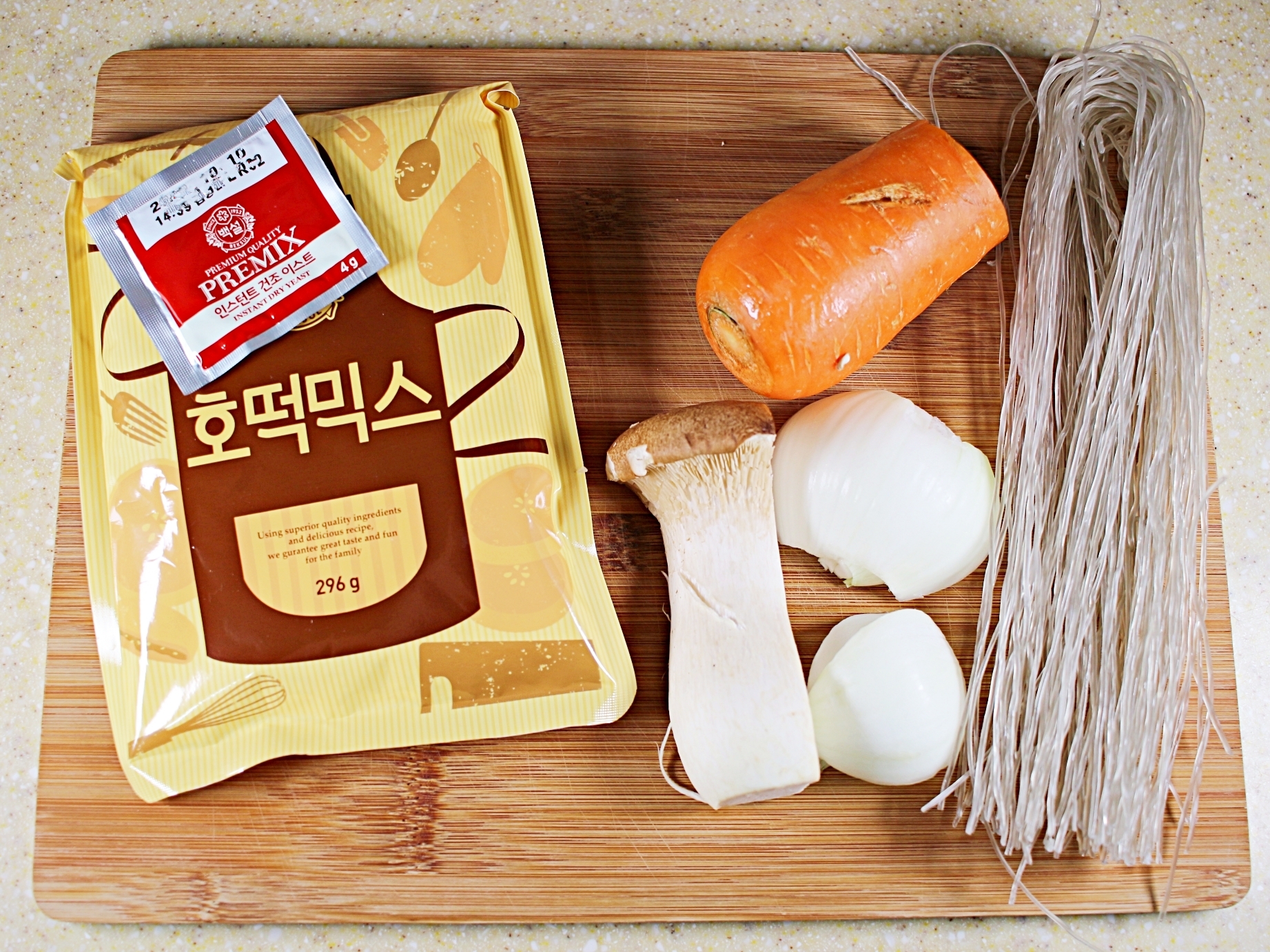 재료는 호떡믹스, 당면, 양파, 당근, 버섯 준비했고요.