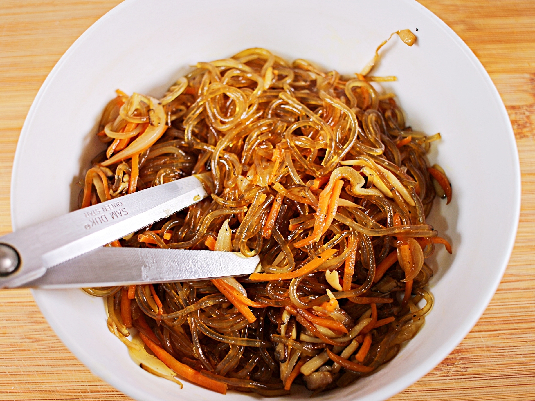 완성된 잡채는 먹기 좋게 가위로 잘라둬요.