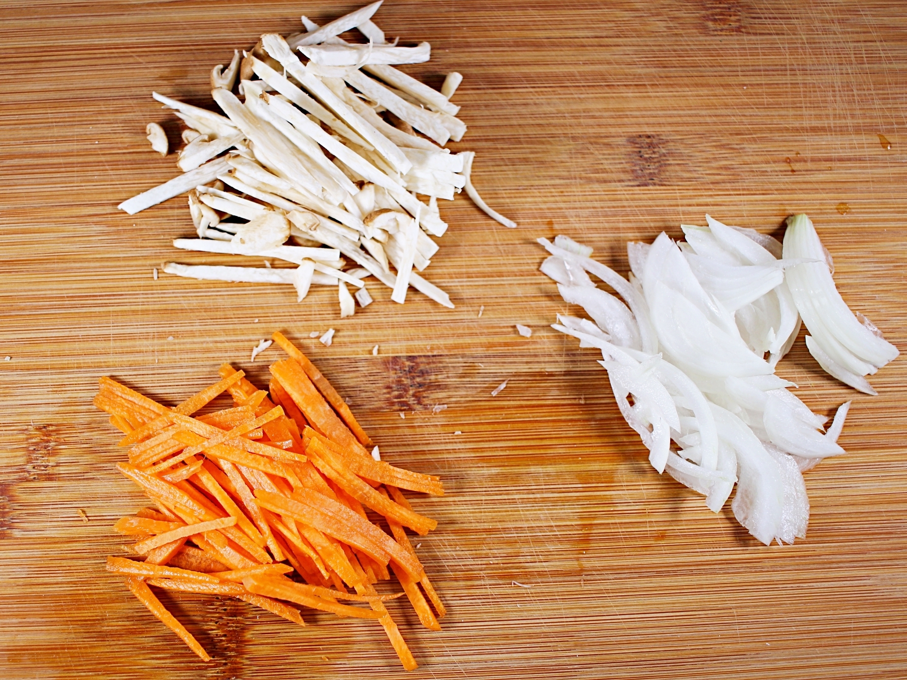 채 썬 양파, 당근, 버섯을 볶아요.
