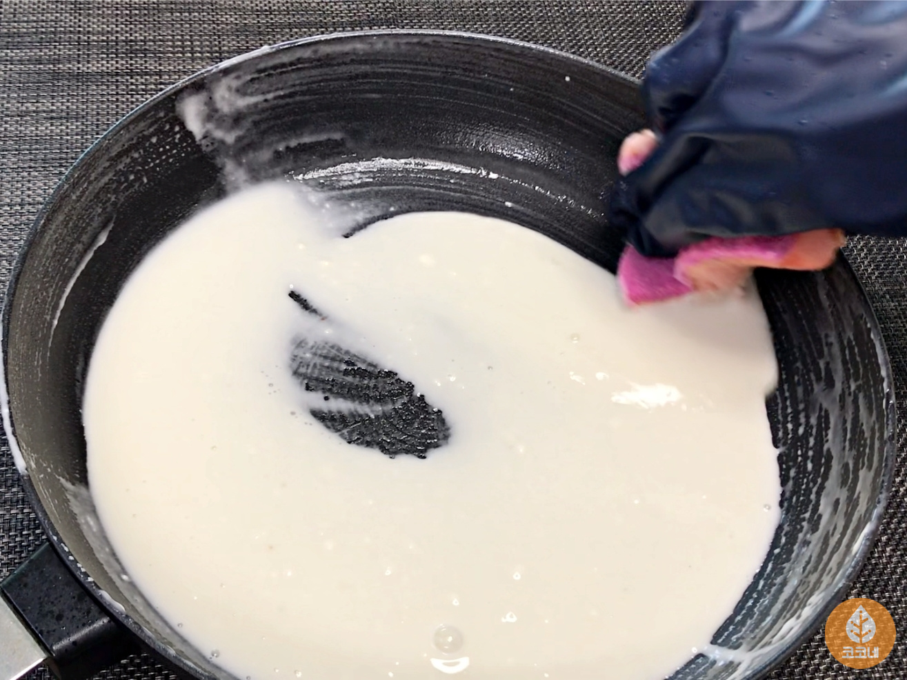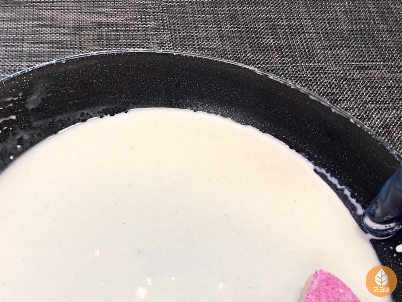 이 밀가루풀을 수세미에 묻혀서 후라이팬을 닦아보세요.
