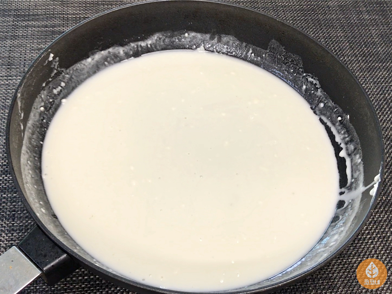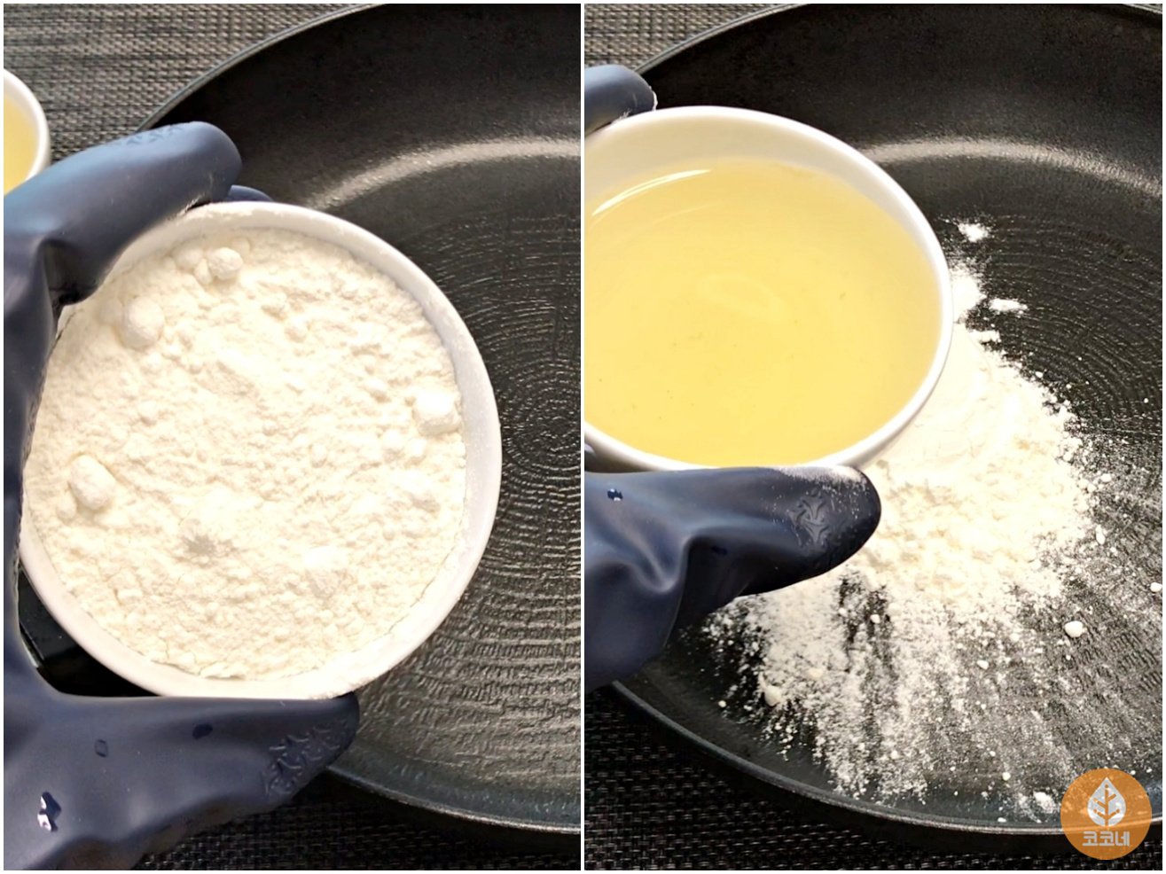 후라이팬에 밀가루1컵, 식초1컵, 그리고 물 1컵을 부어요.