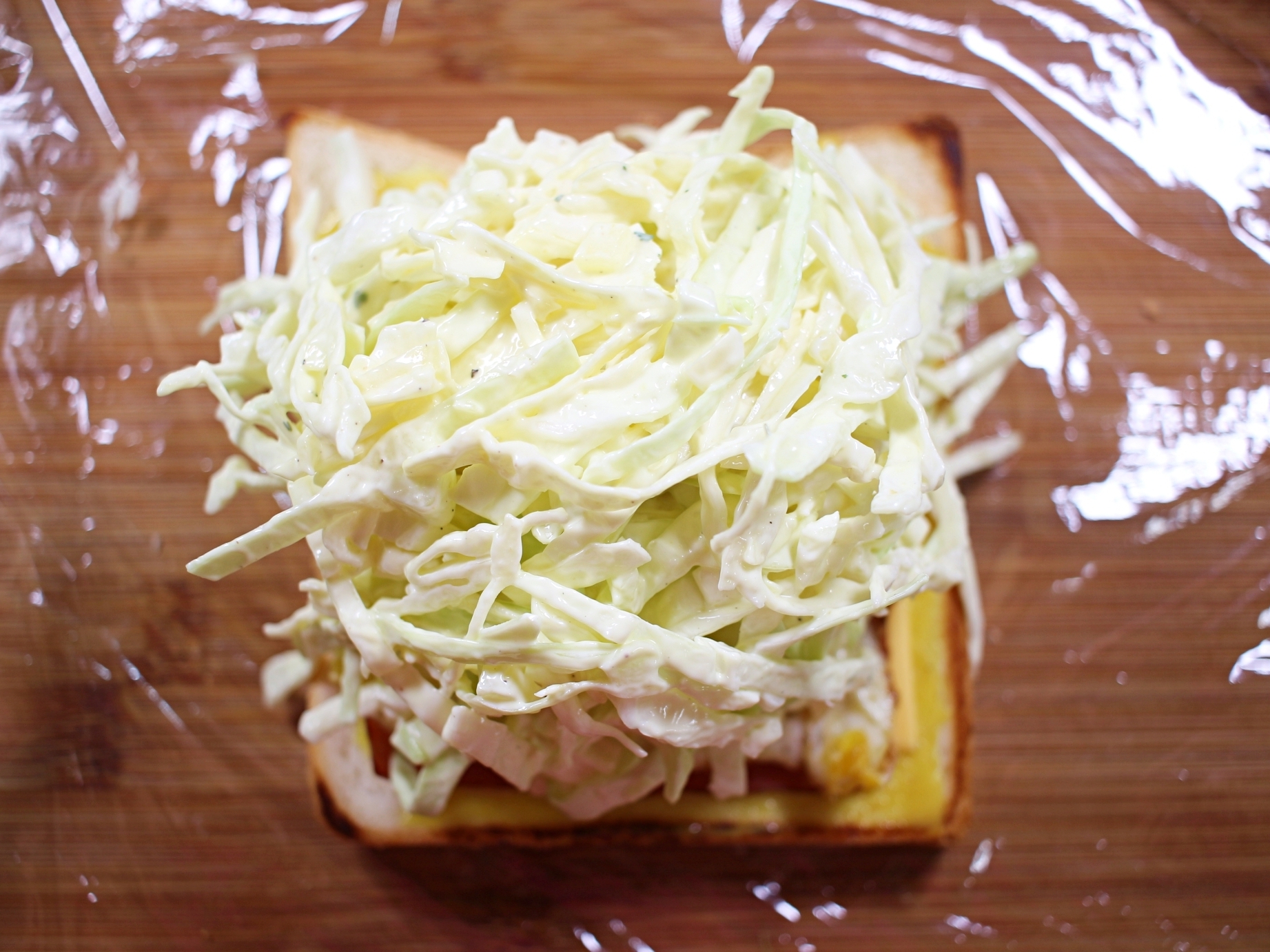 치즈, 햄, 달걀, 양배추 샐러드 듬뿍 올려주세요.