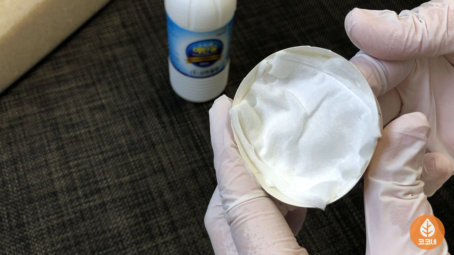 종이컵에 화장솜을 두툼하게 깔아주시고요.