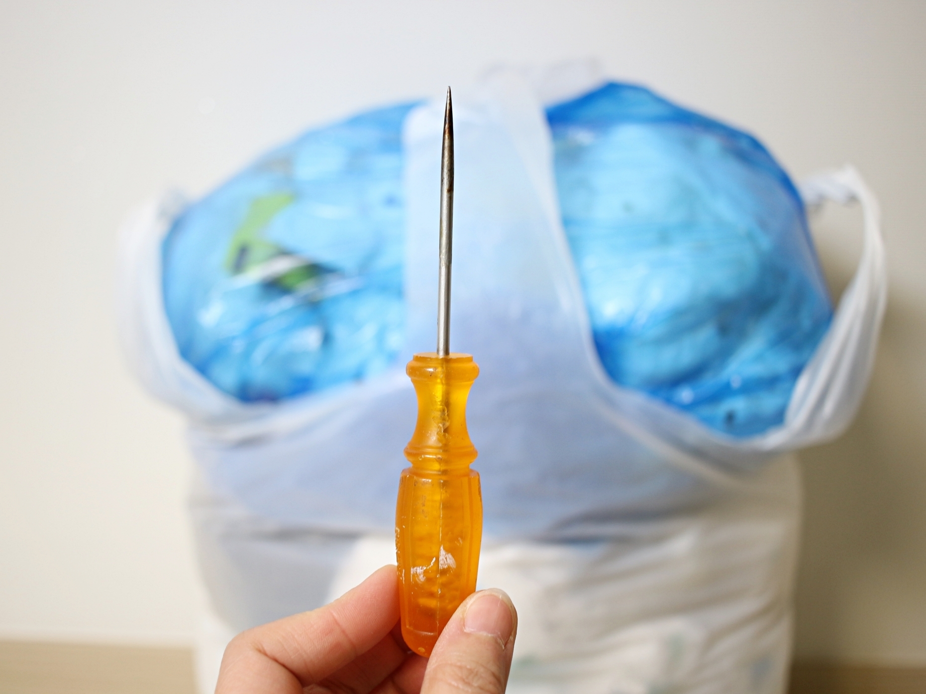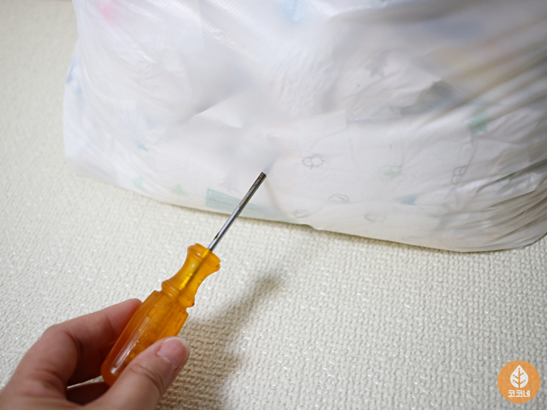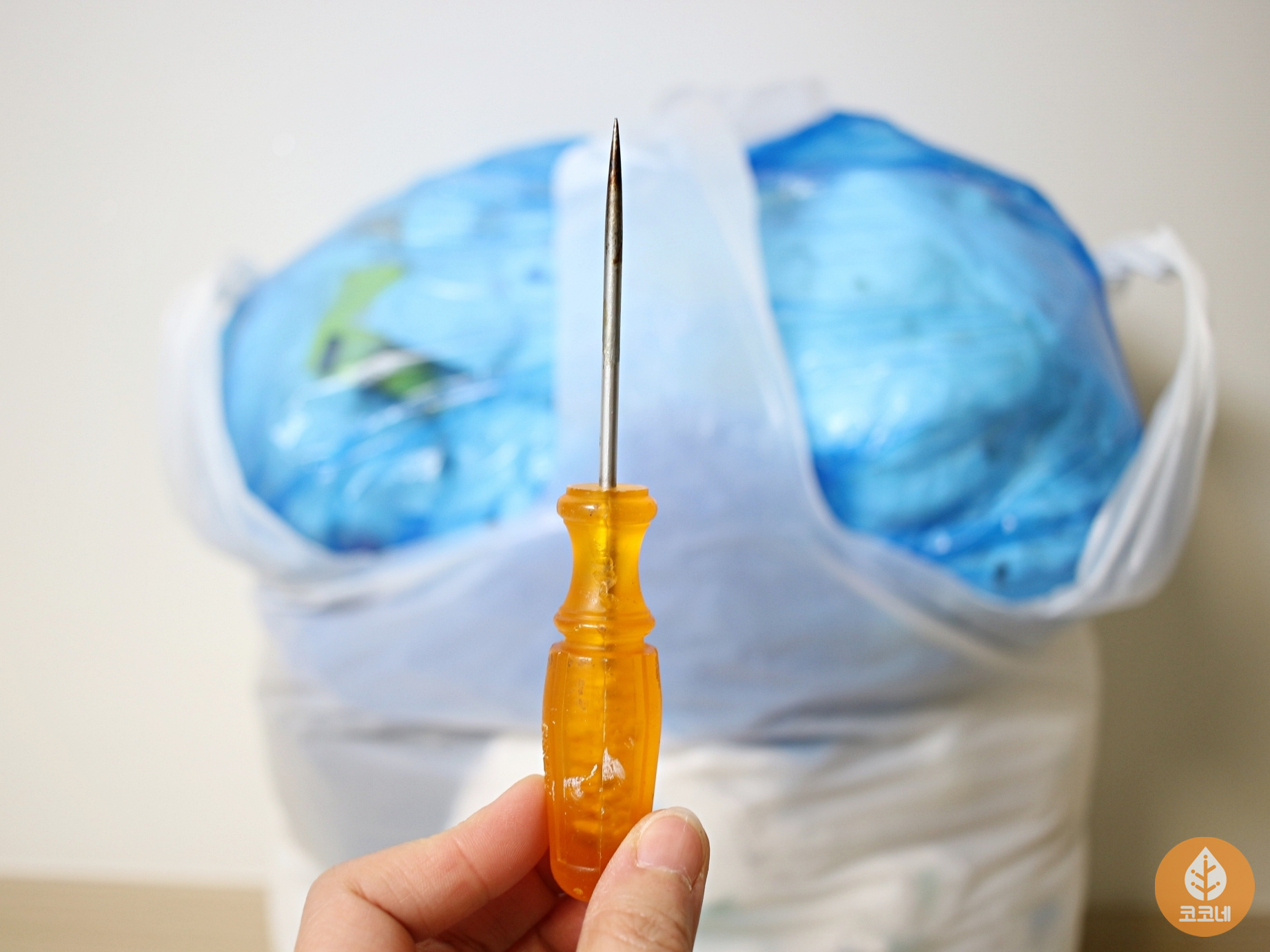 종량제봉투 하단에 송곳으로 구멍을 뽕- 뚫어요.