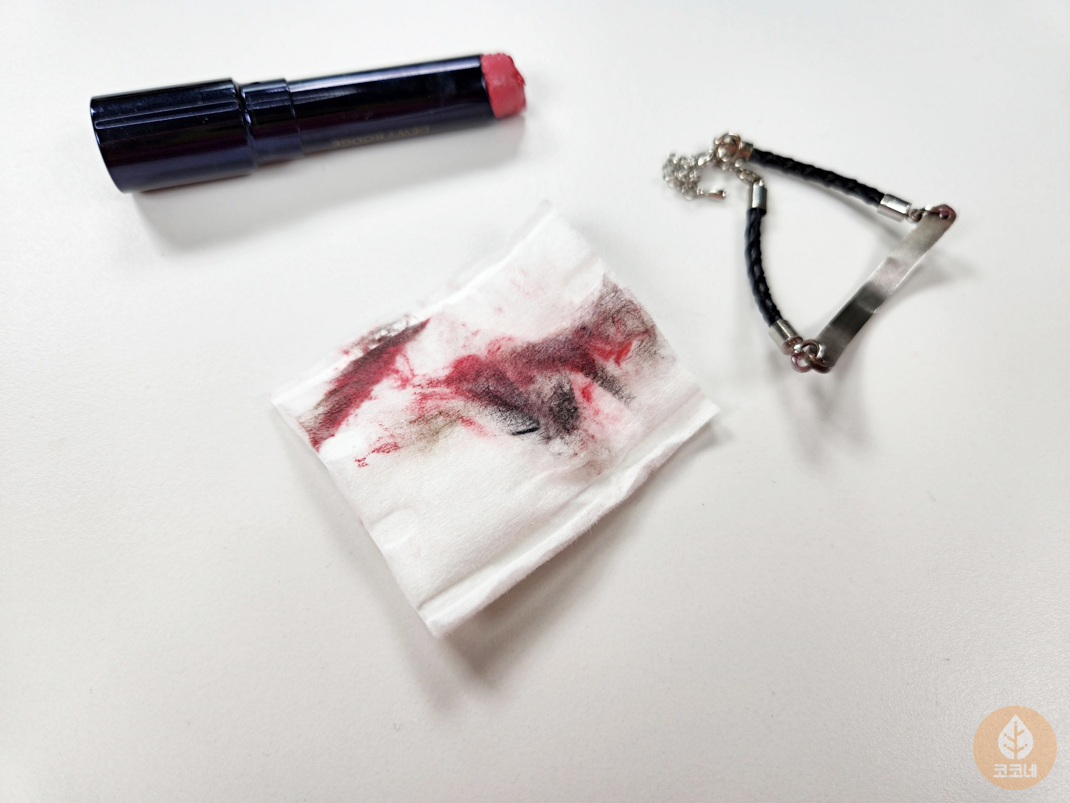 스테인리스 제품에 립스틱을 바르고