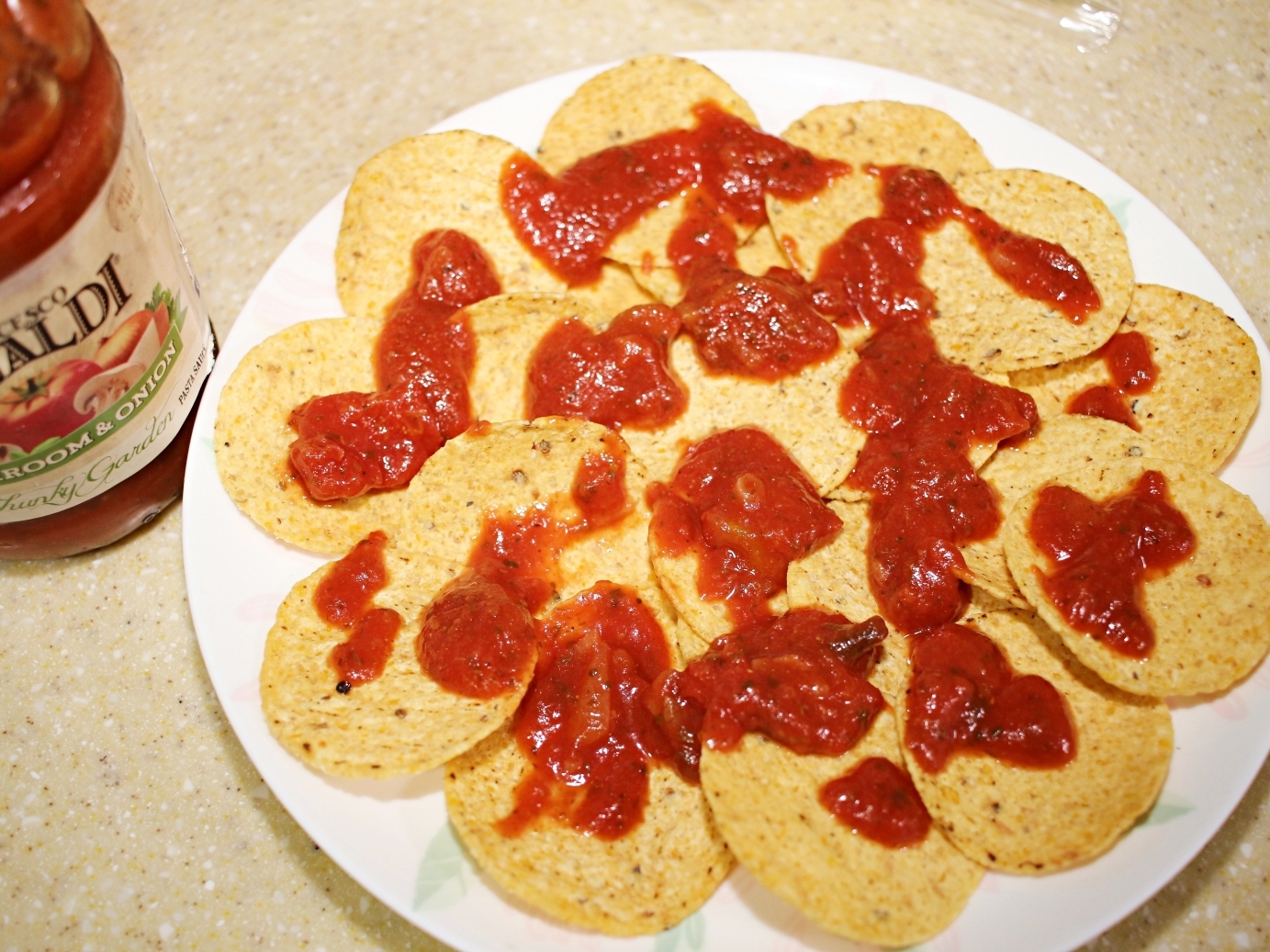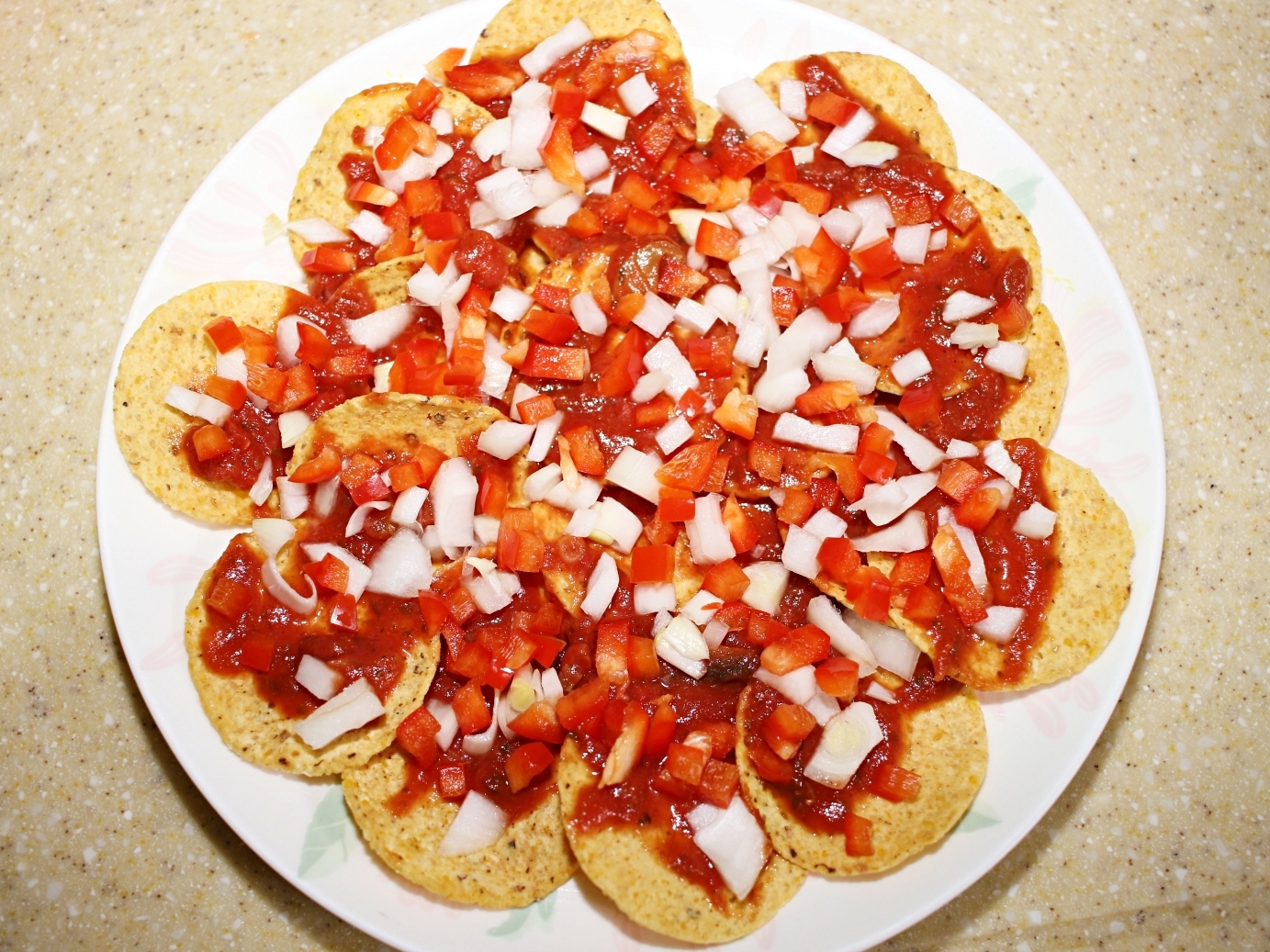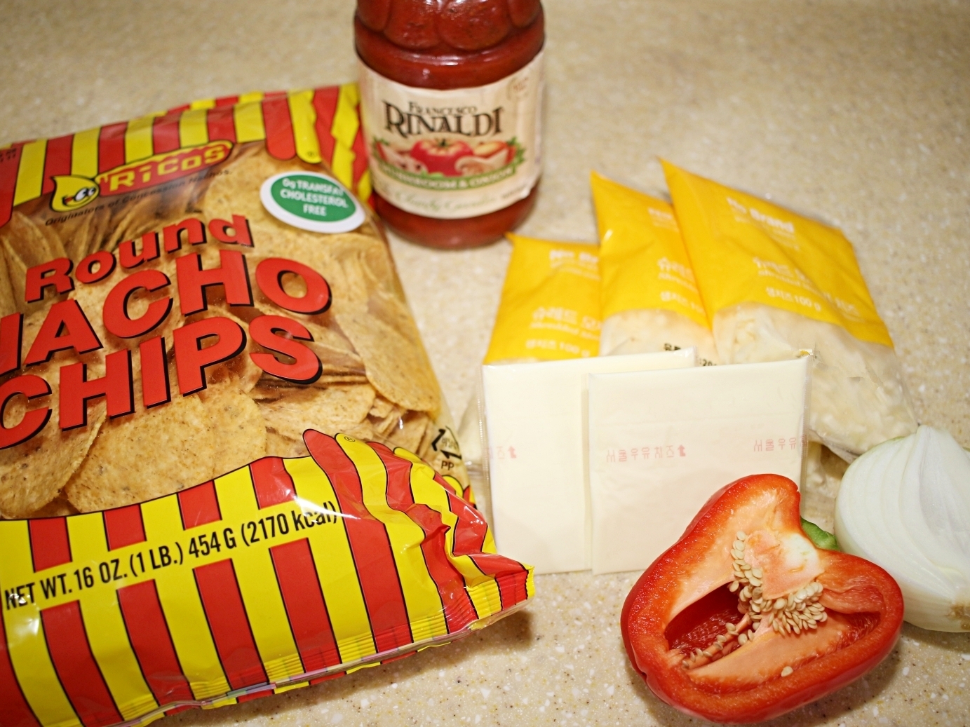 재료는 나초, 토마토소스, 치즈, 파프리카, 양파 준비했고요.