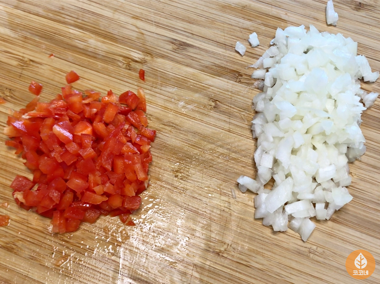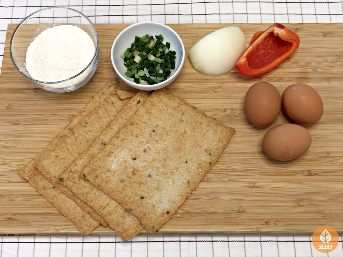 재료는 사각어묵, 달걀, 밀가루, 양파, 파프리카, 쪽파에요.