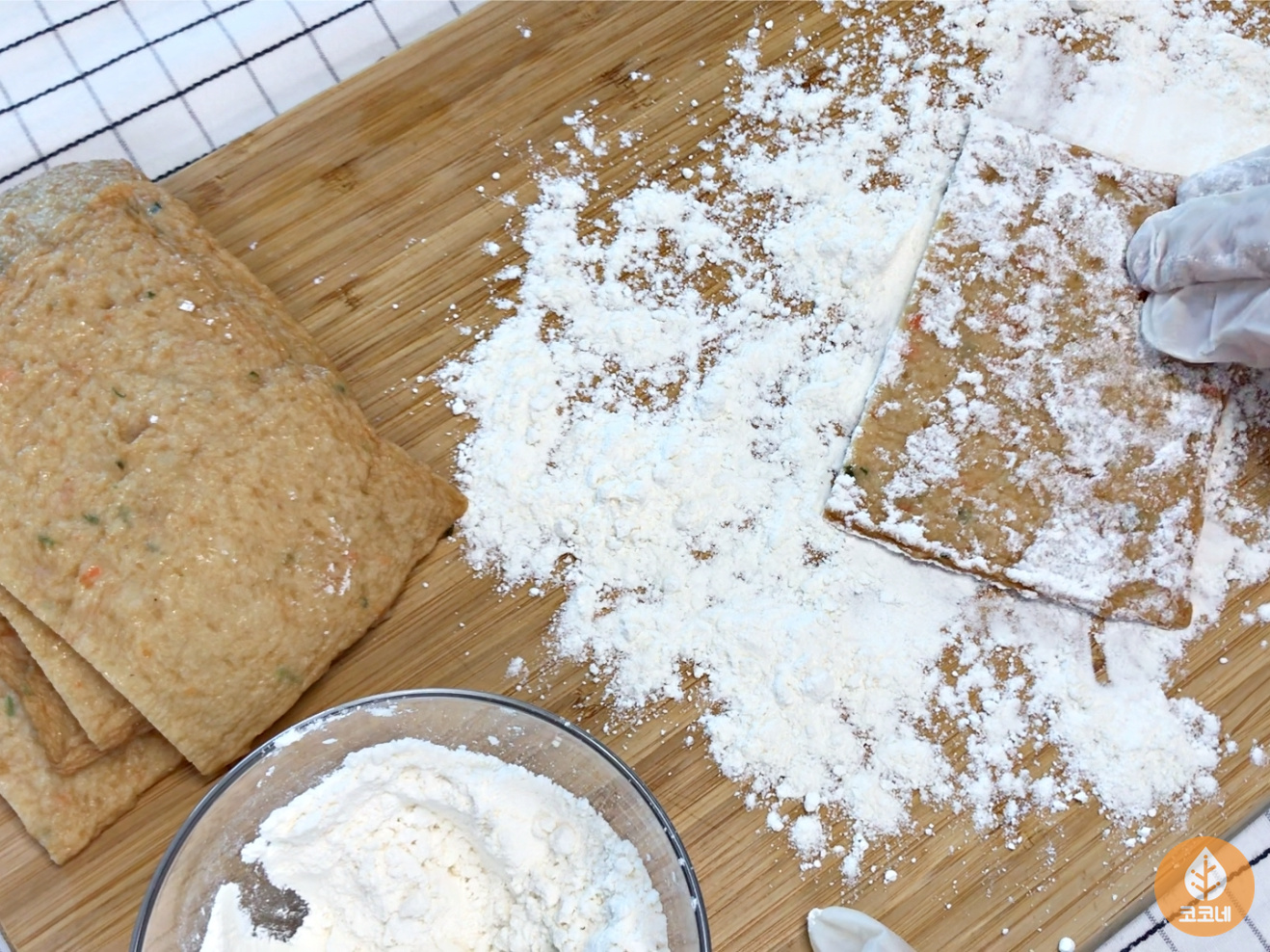 어묵의 물기를 제거한 뒤에 밀가루옷을 얇게 입혀주세요.