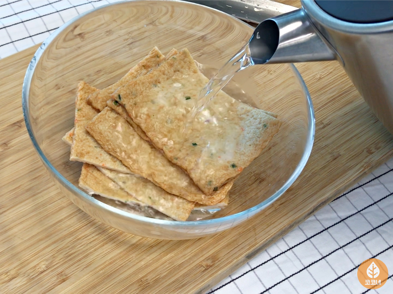 사각어묵을 뜨거운물에 5분만 담가서 기름기를 빼주세요.