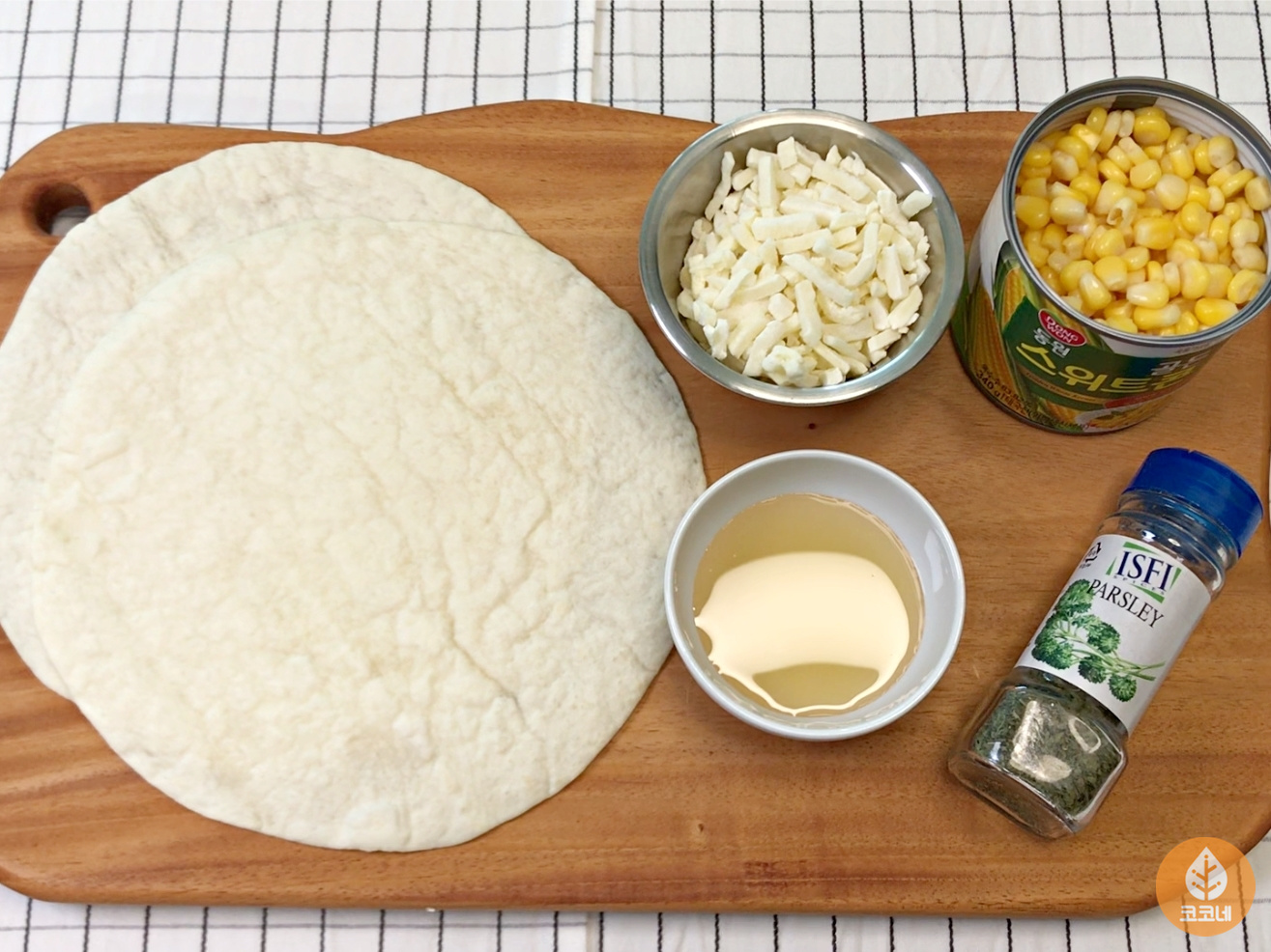 재료는 캔옥수수, 모짜렐라치즈, 또띠아, 꿀 준비했어요.