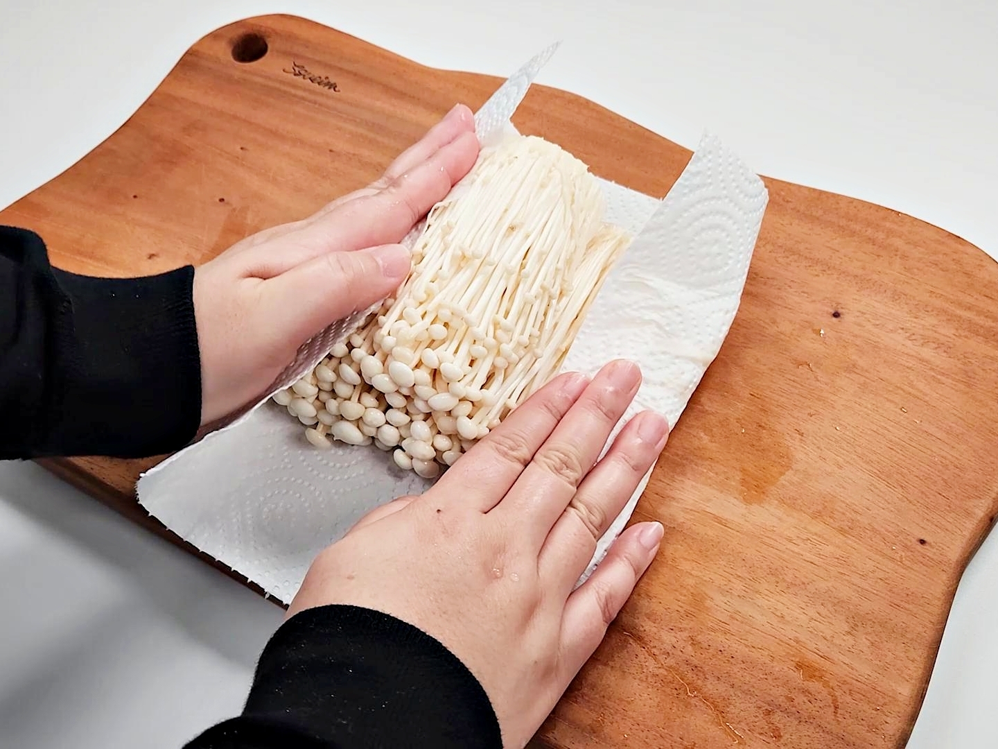 세척을 마친 팽이버섯은 키친타월로 부드럽게 물기를 제거한 뒤