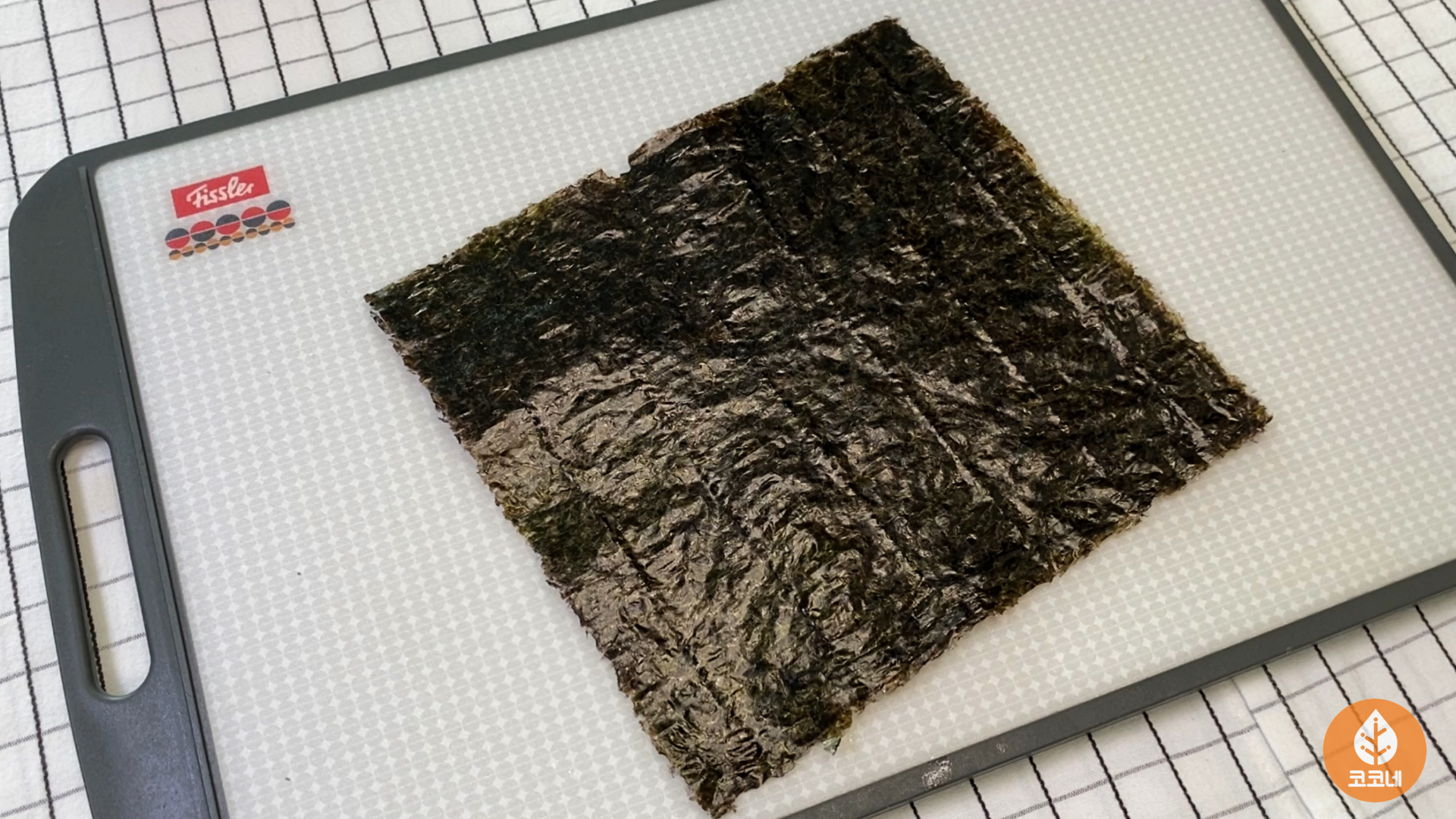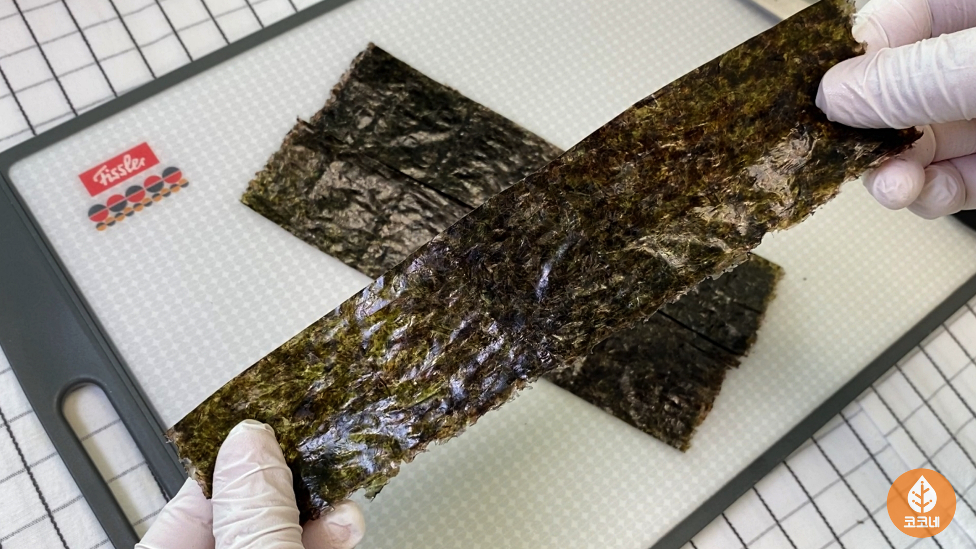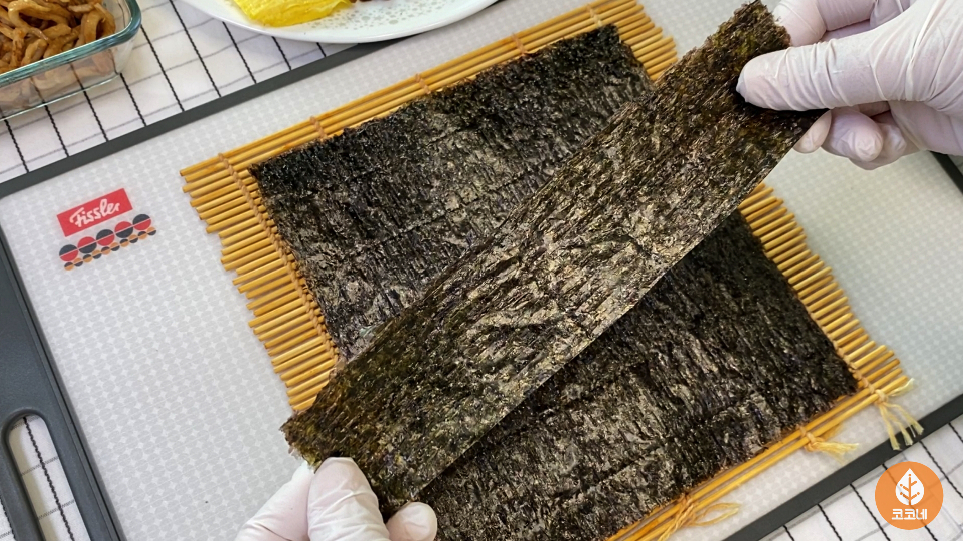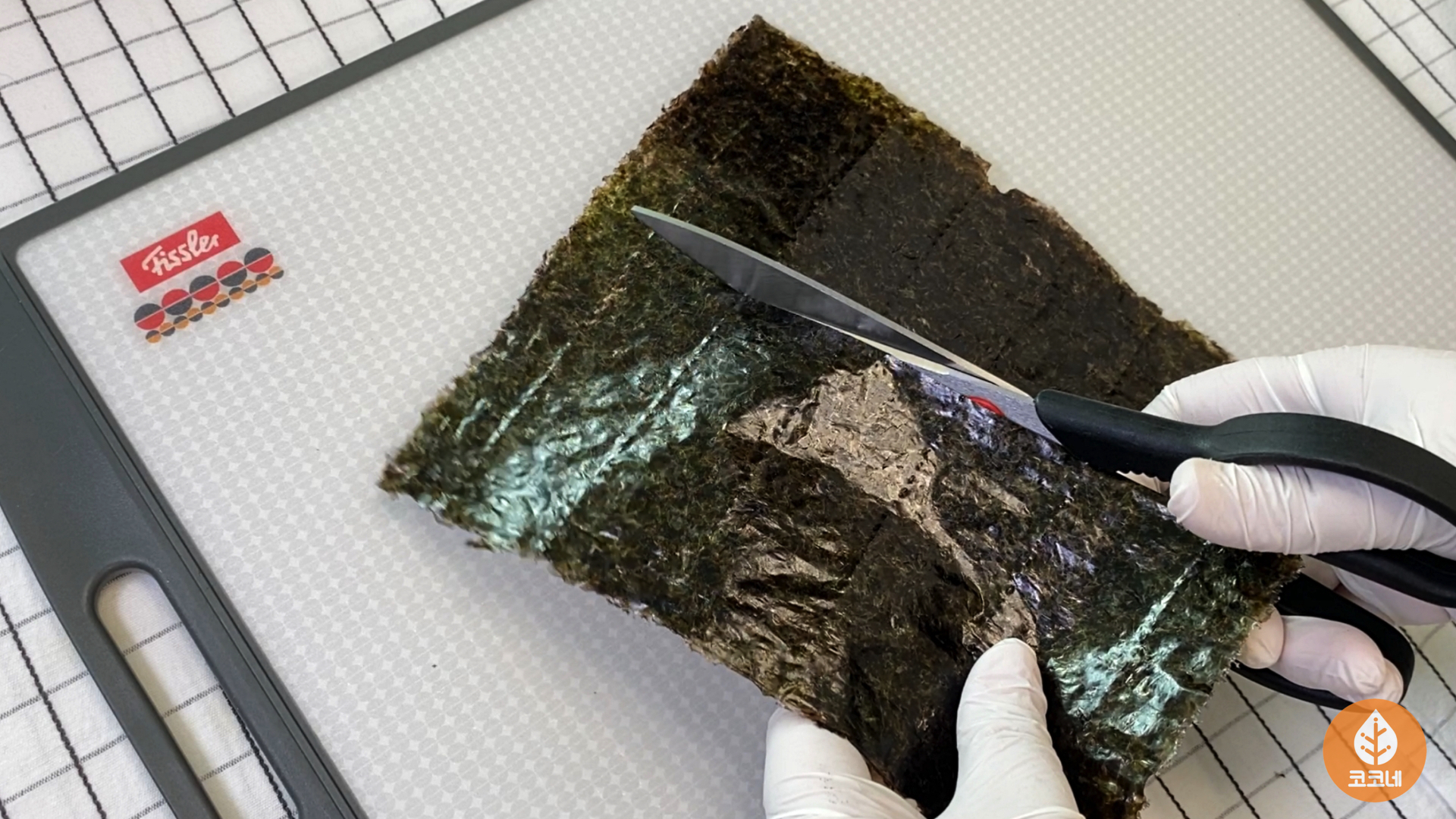 일단 김밥용 김을 길쭉하게 썰어주세요.
