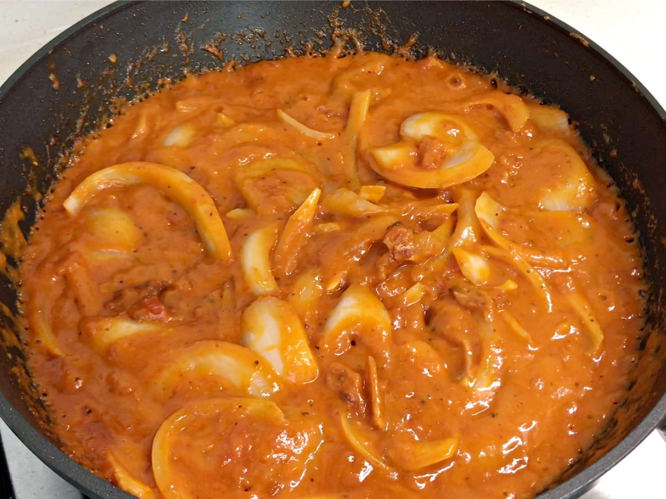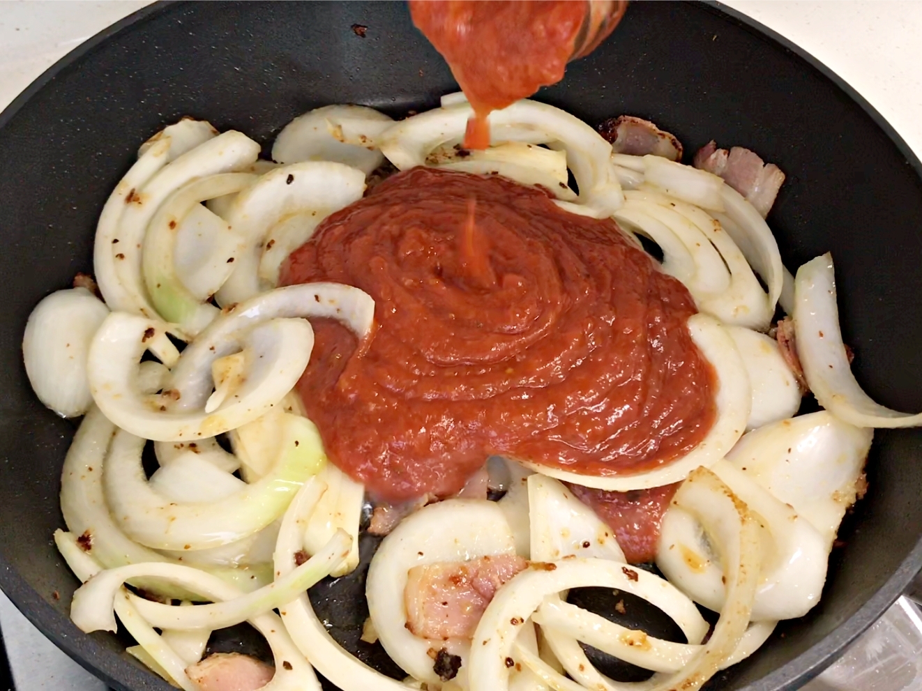 양파가 투명하게 변하기 전에 토마토소스를 부어주세요.
