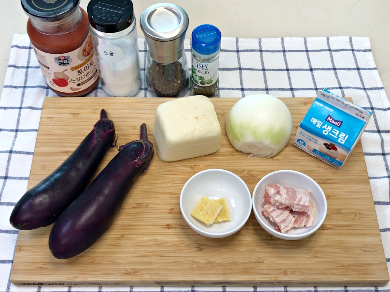 재료는 가지, 모짜렐라치즈, 양파, 베이컨, 다진마늘,