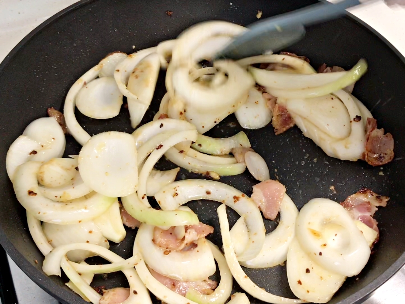 여기에 한입 크기로 썬 베이컨과 양파를 넣고 달달 볶아요.