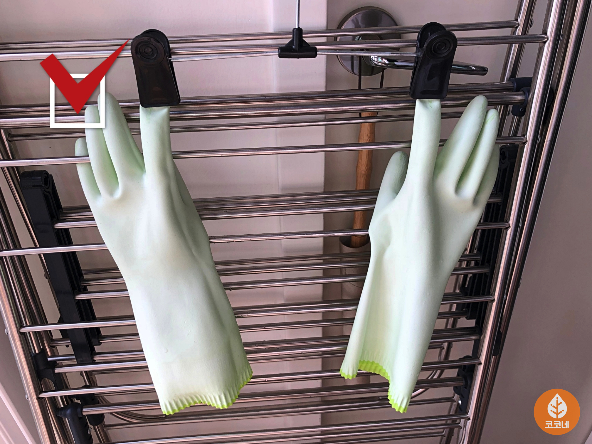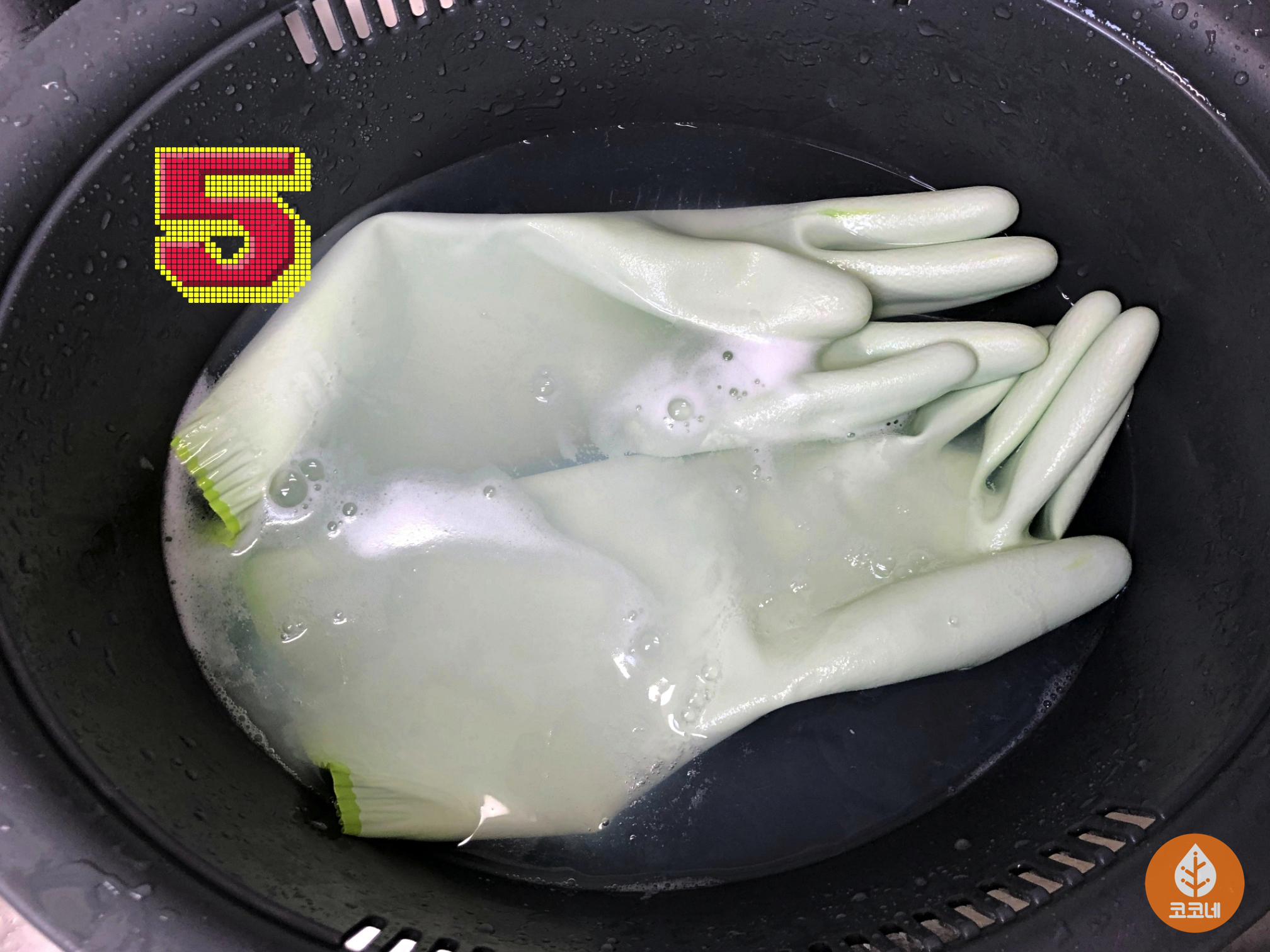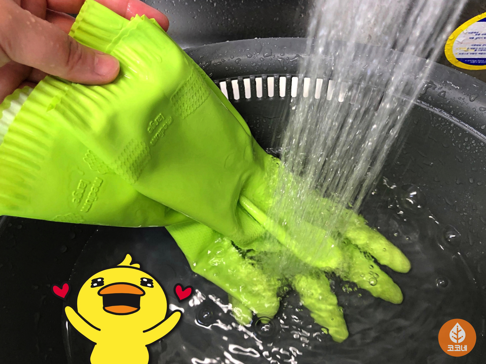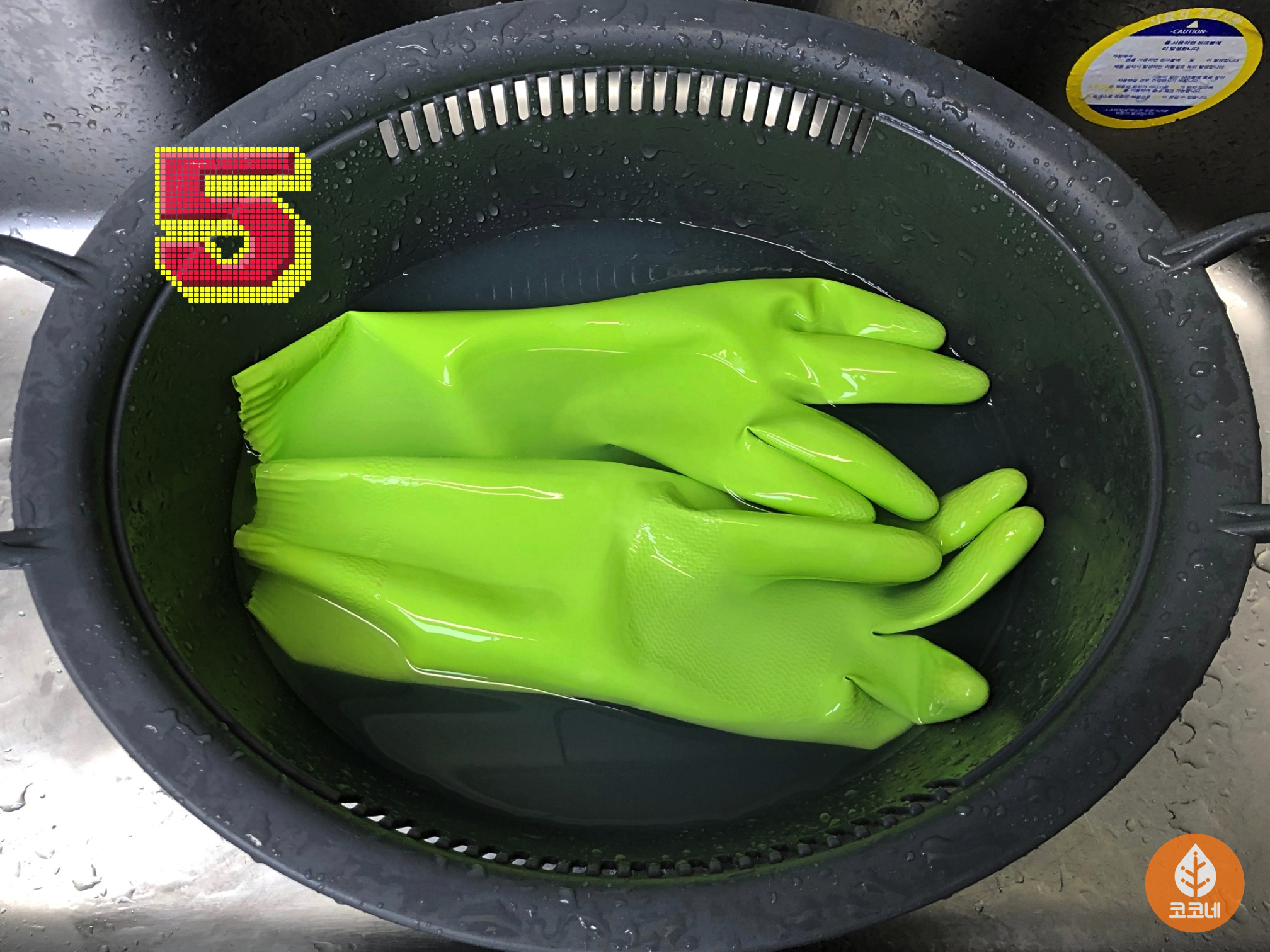 흐르는 물로 가볍게 헹궈낸 고무장갑에