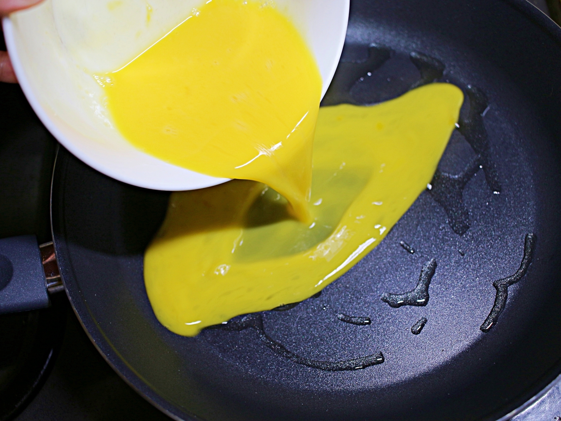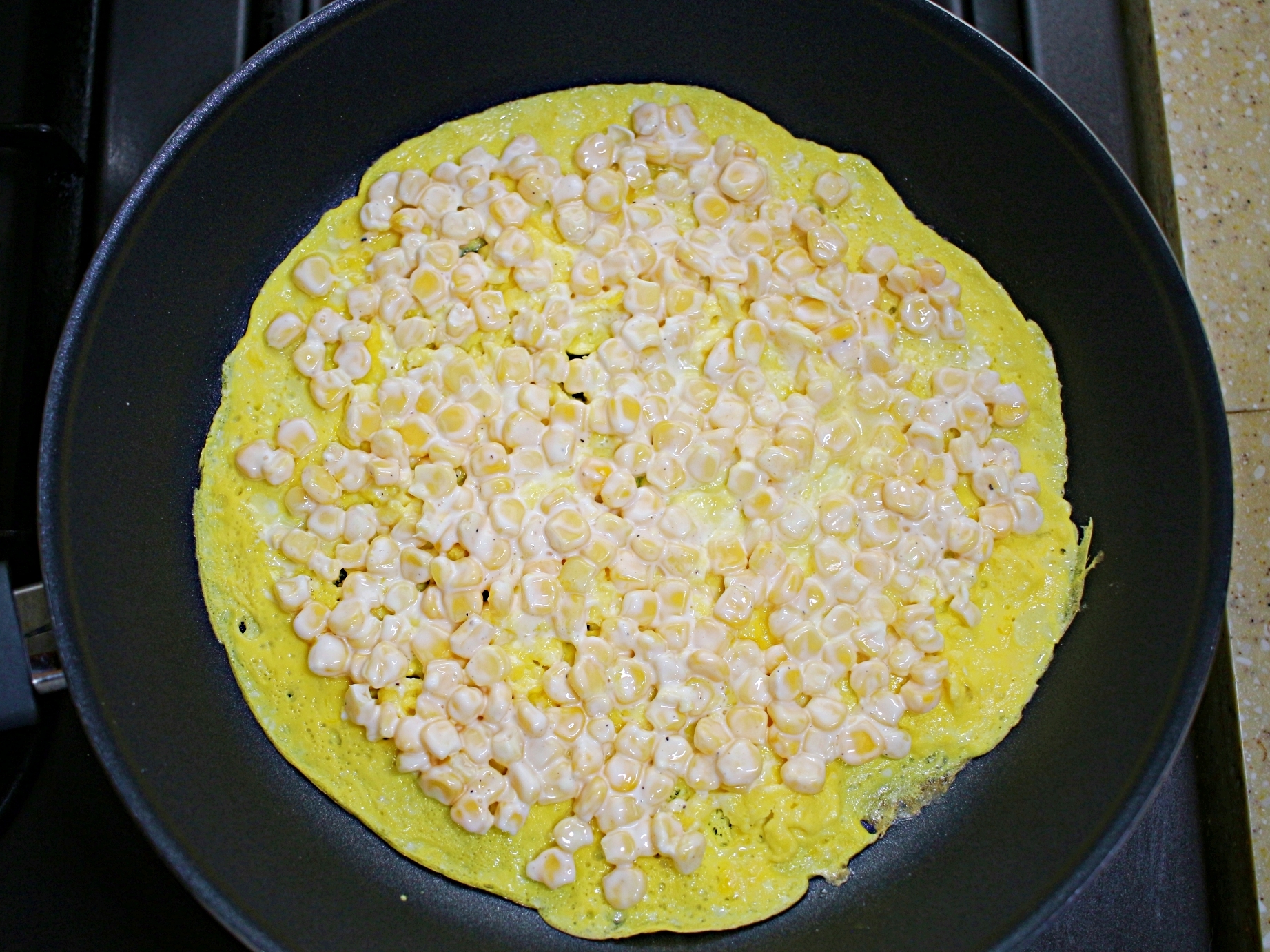 계란이 70%정도 익으면 콘샐러드를 올려주세요.