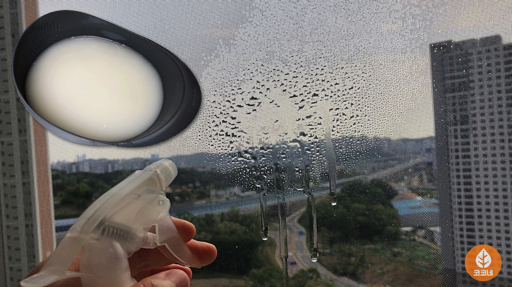 방충망에 뿌린 쌀뜨물이 흐르면서