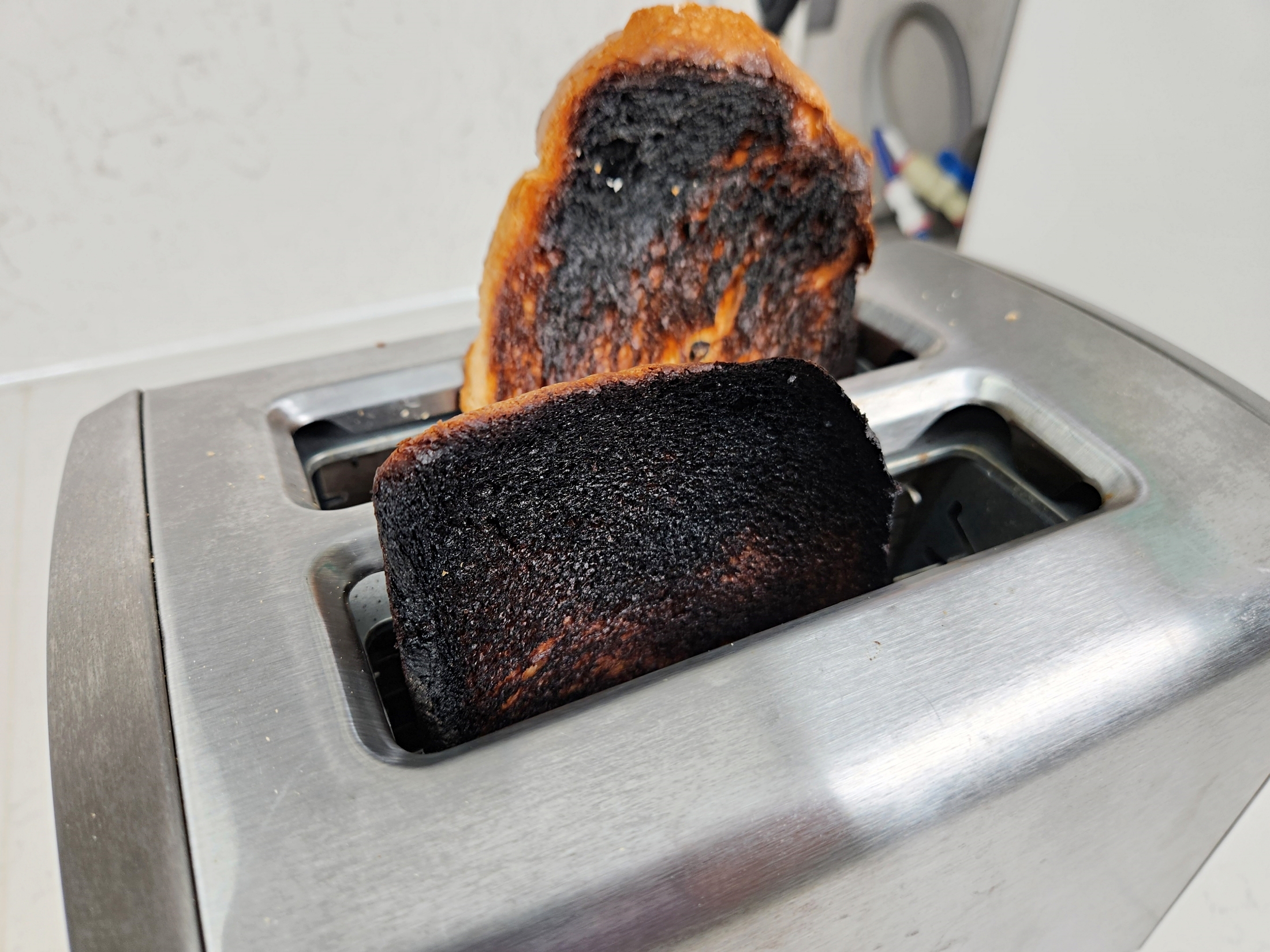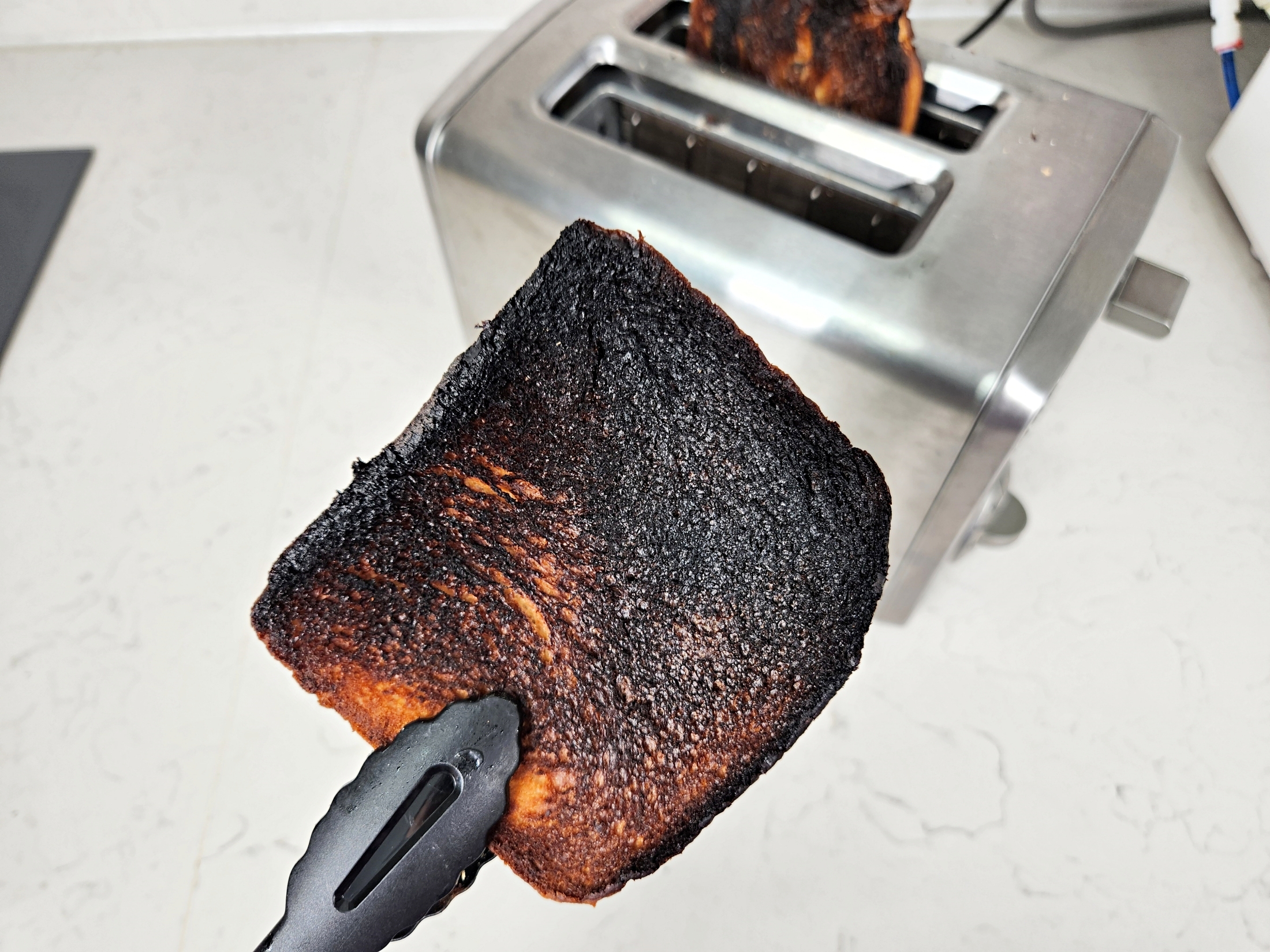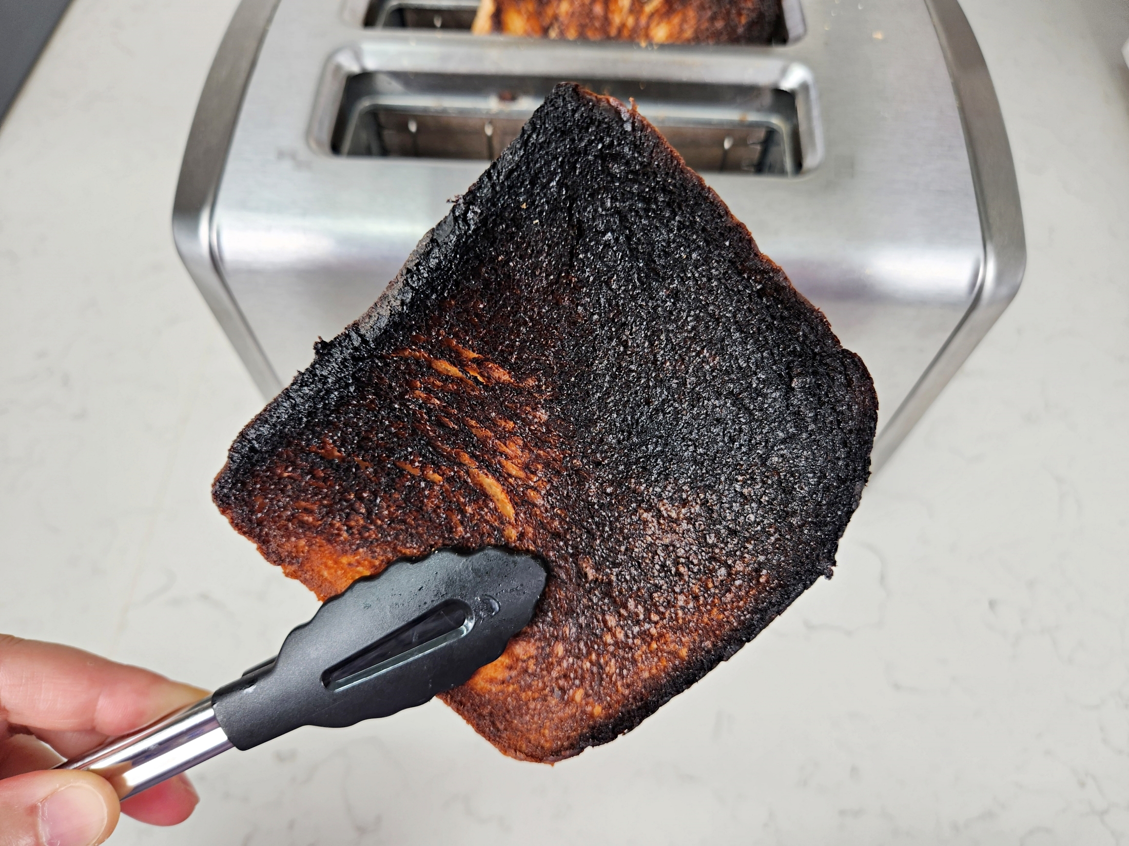 거의 숯처럼 보일 정도로 새까맣게 변한 식빵을 확인할 수 있어요.