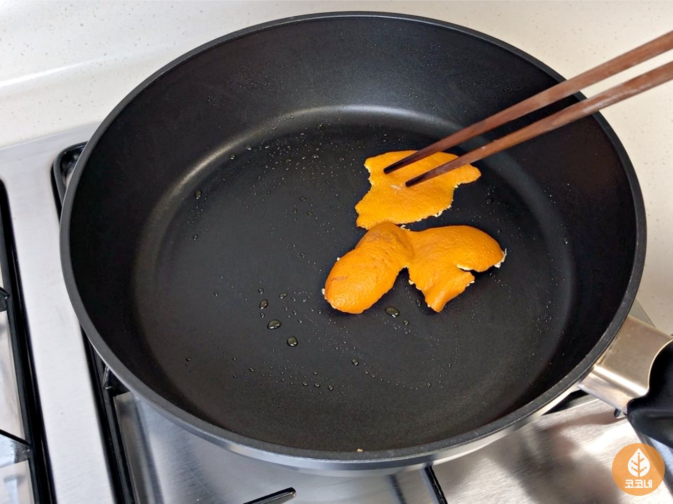 후라이팬에 가득한 기름기를 귤껍질로 흡수시키면