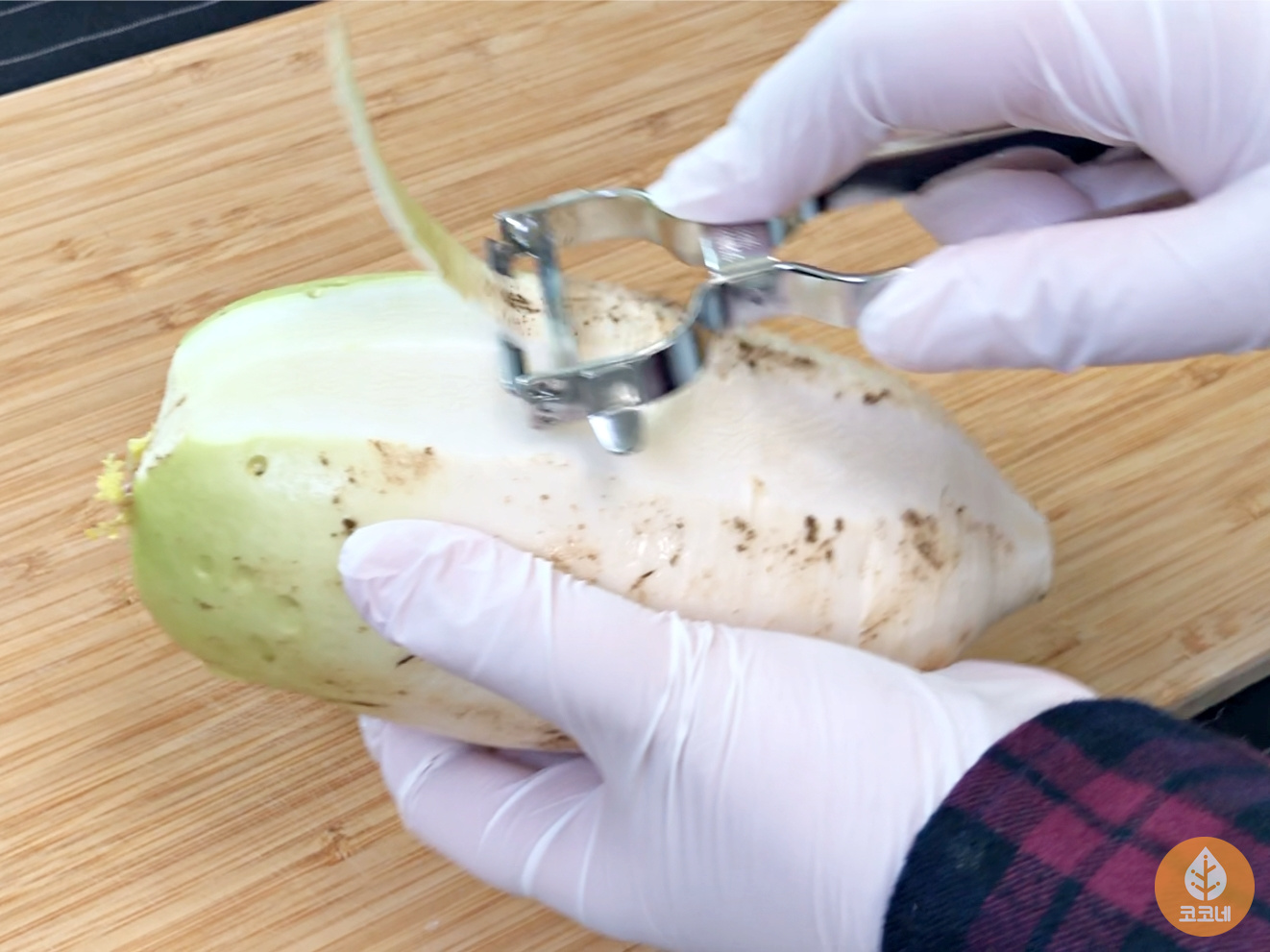 먼저 무청을 잘라내고 껍질을 벗겨내요.