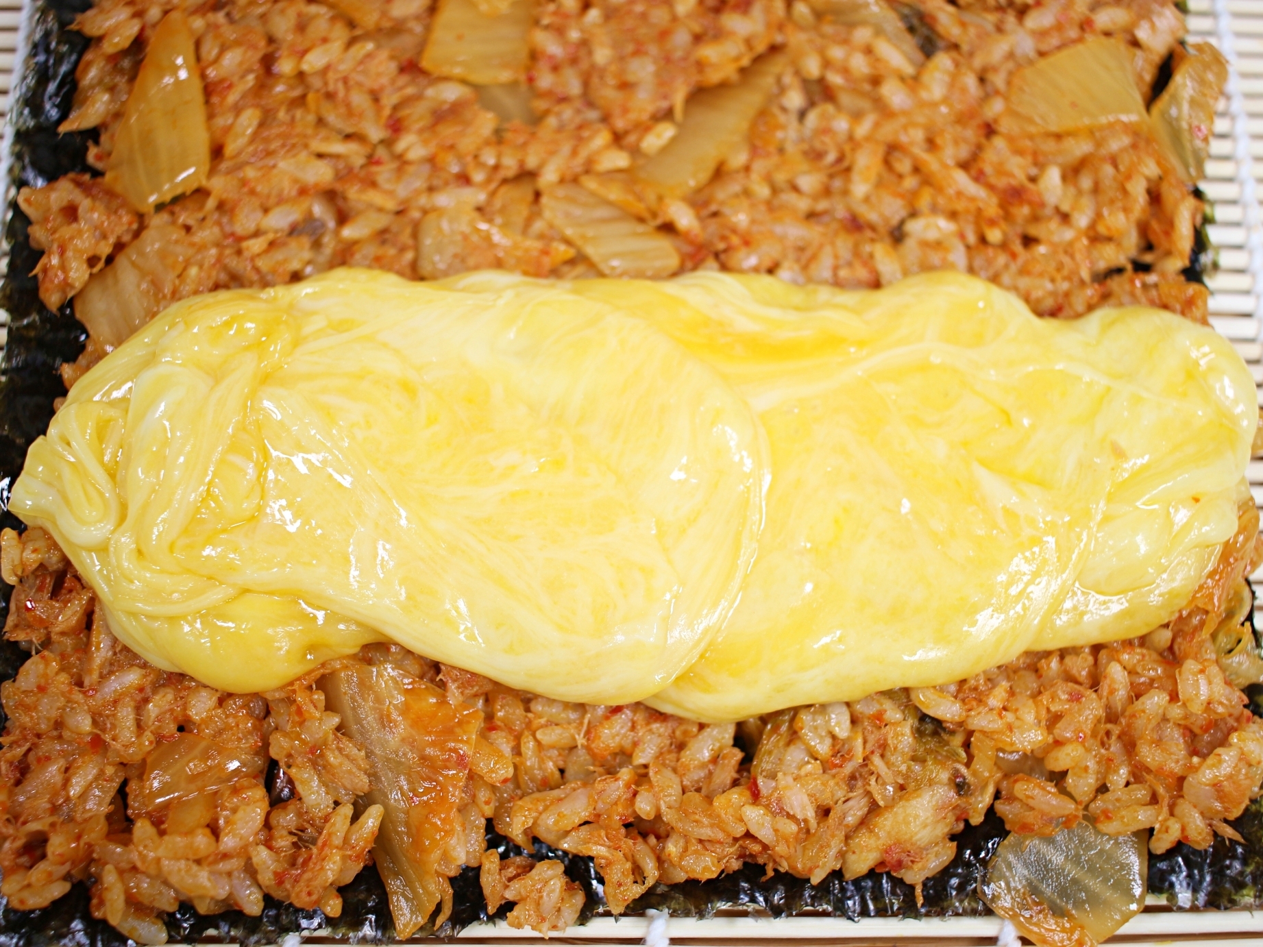 김밥김 위에 김치볶음밥을 펼쳐 주시고요.