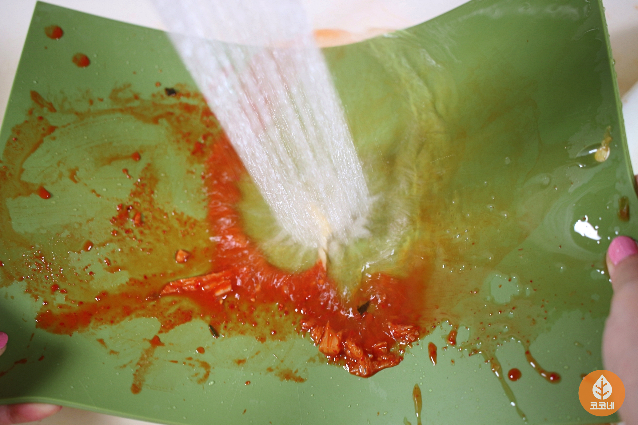 도마를 물에 먼저 헹구고 김치를 썰어보세요.